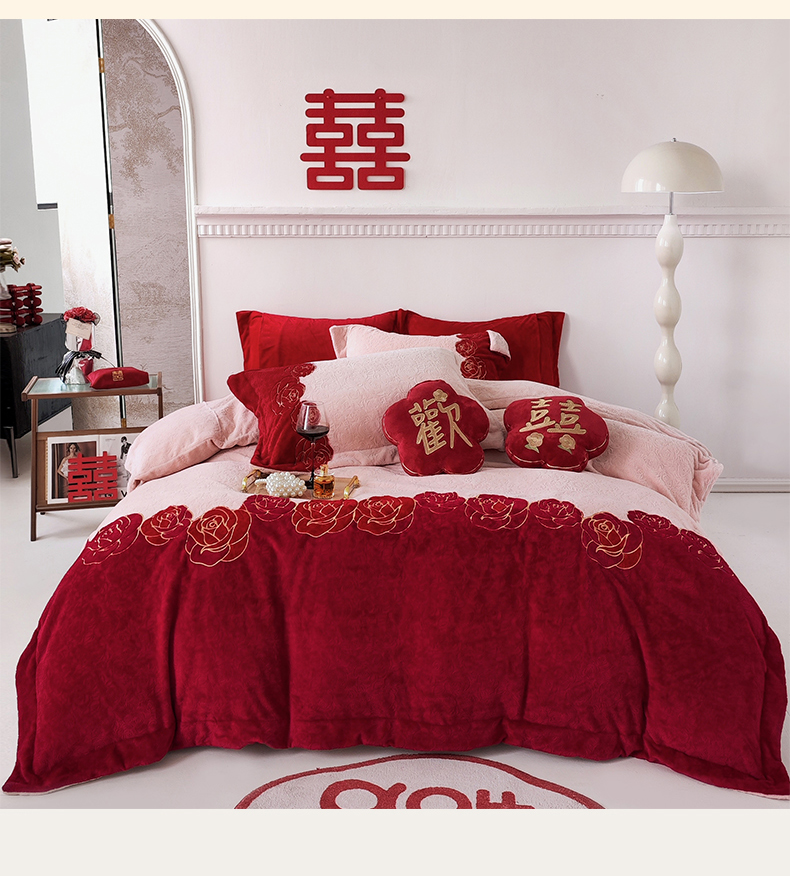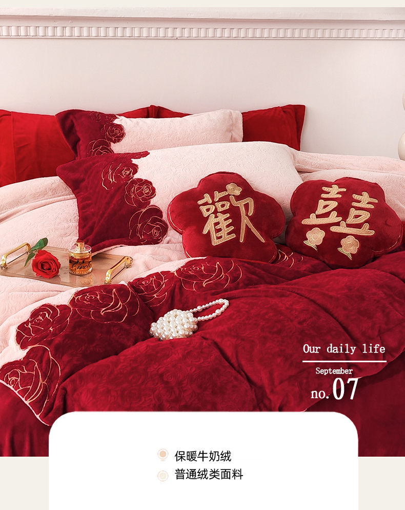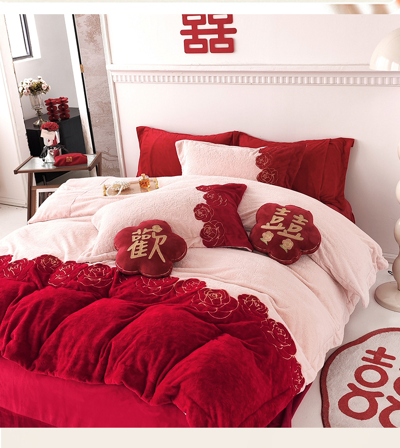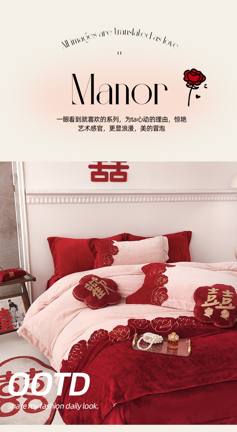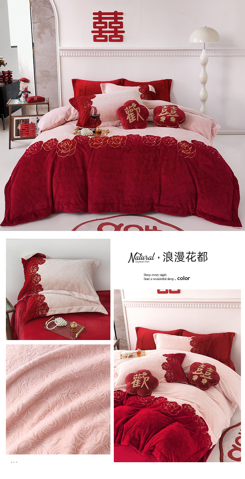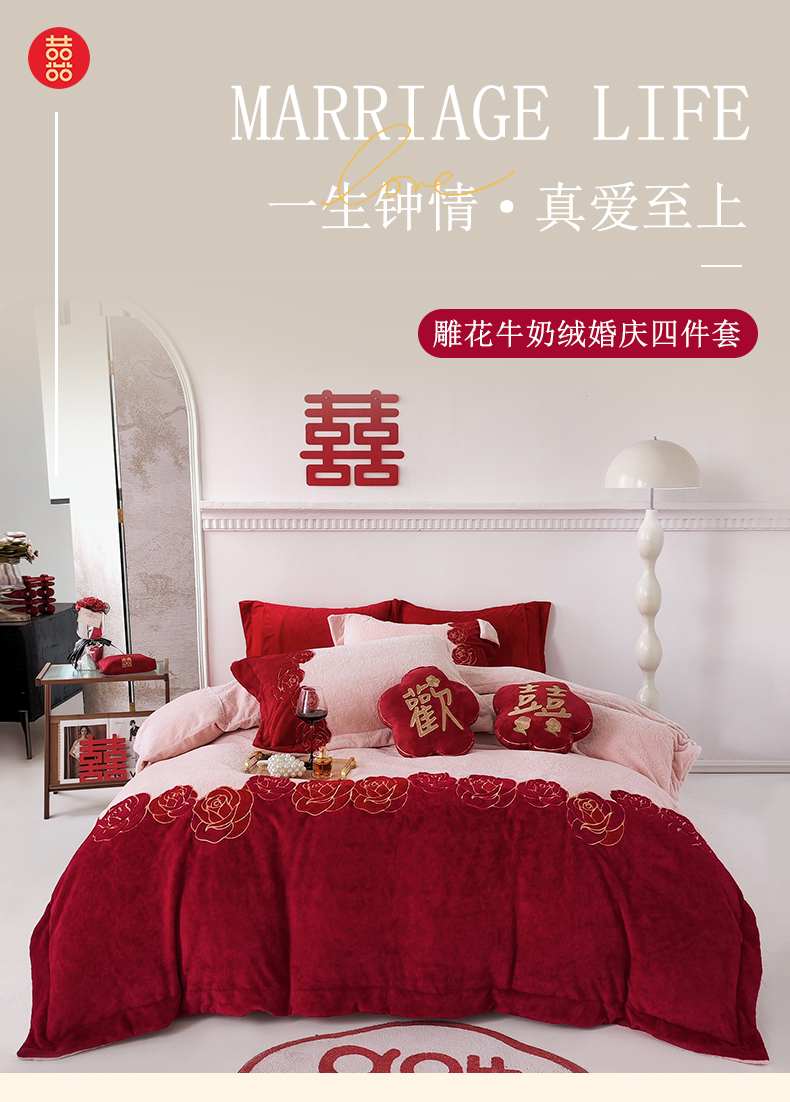 甜咪咪婚庆 2024新品婚庆雕花绒牛奶绒刺绣结婚四件套多件套 小红书推荐爆款 浪漫花都