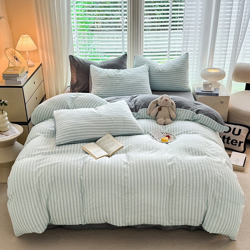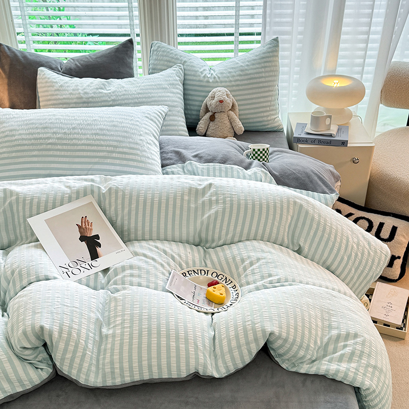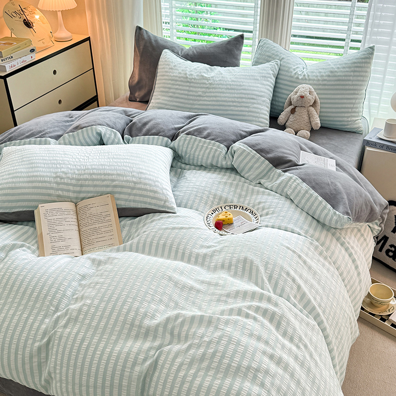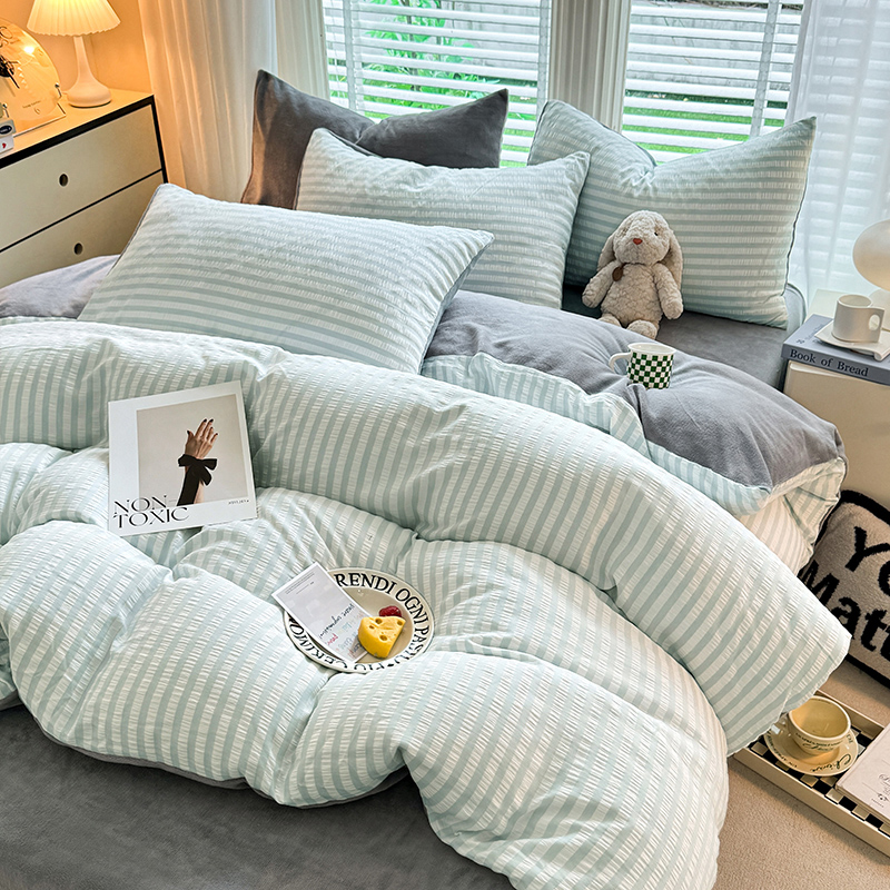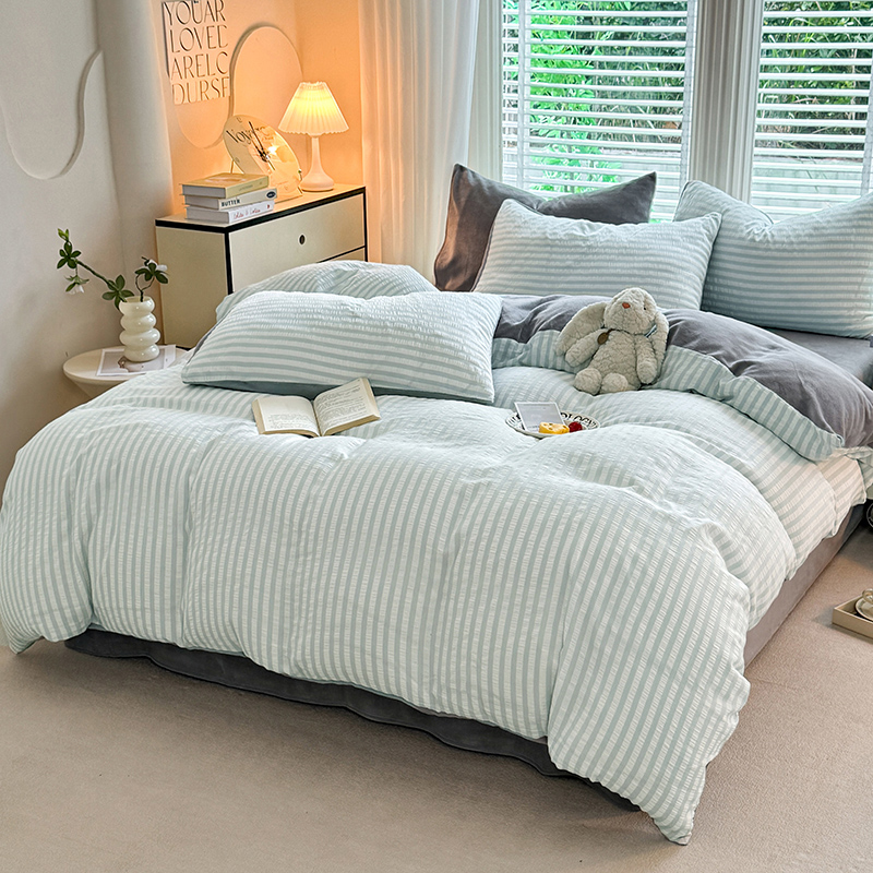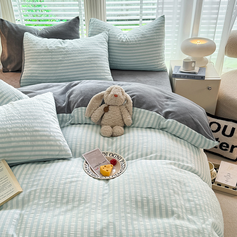 当前位置: 91家纺网 > 商品网购 > 床品套件 > 四件套 > 牛奶绒四件套 > 恩和 2024新款水洗棉提花拼牛奶绒套件 蓝白条