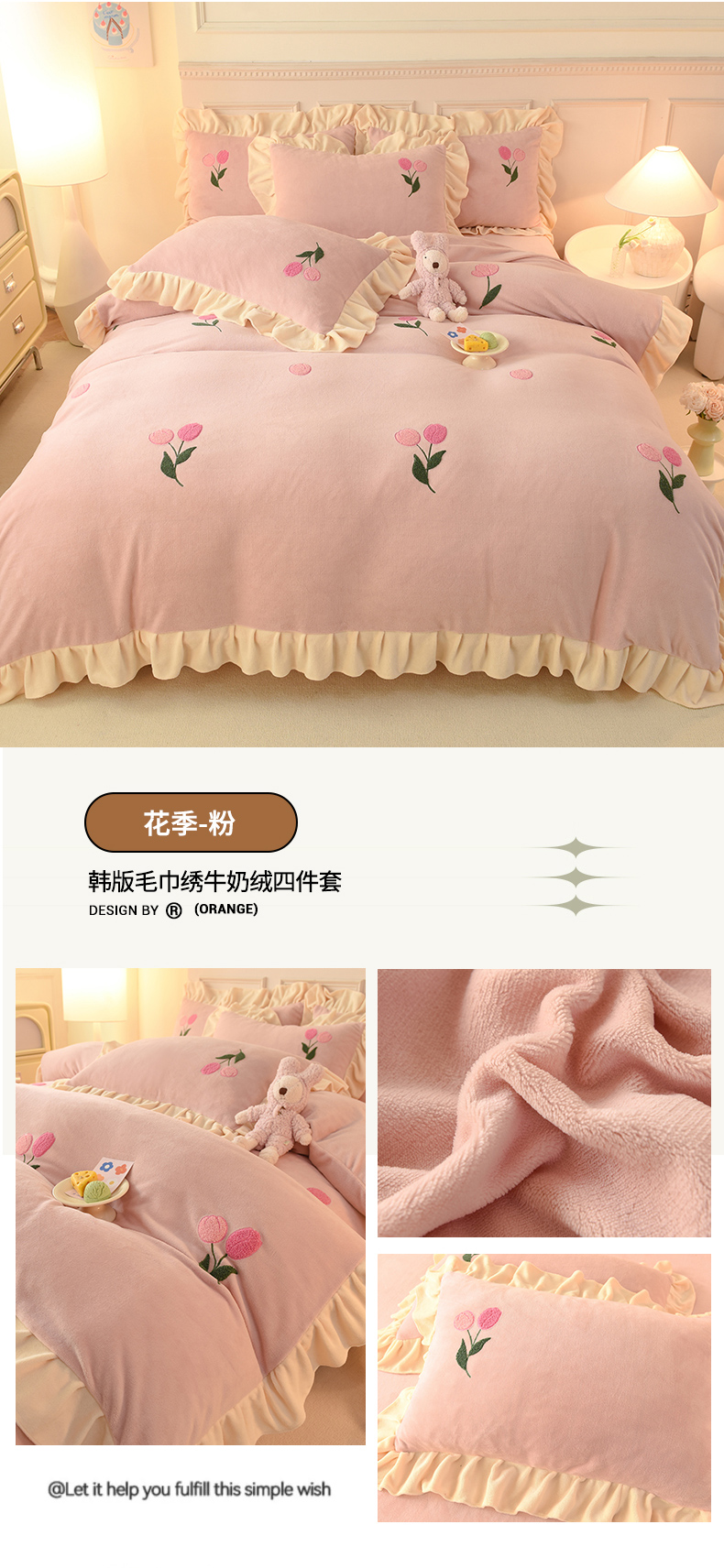首尔 2024新款牛奶绒韩版毛巾绣四件套 花季-粉