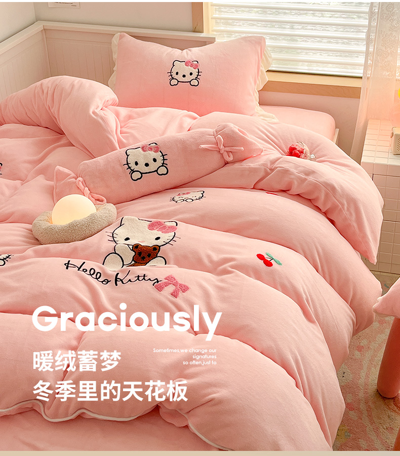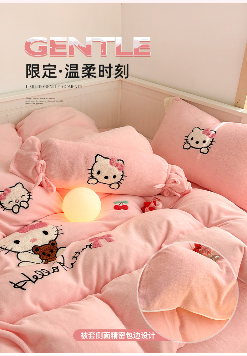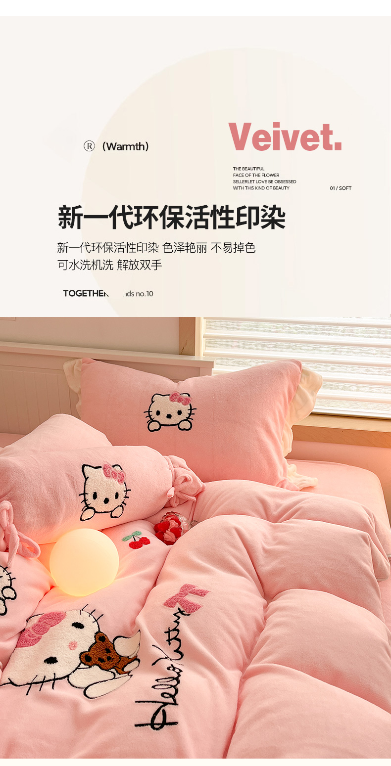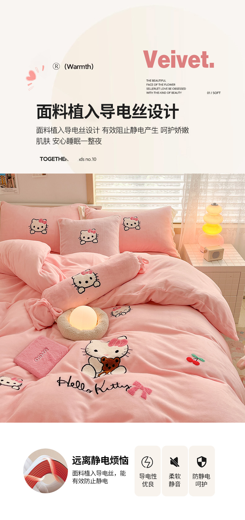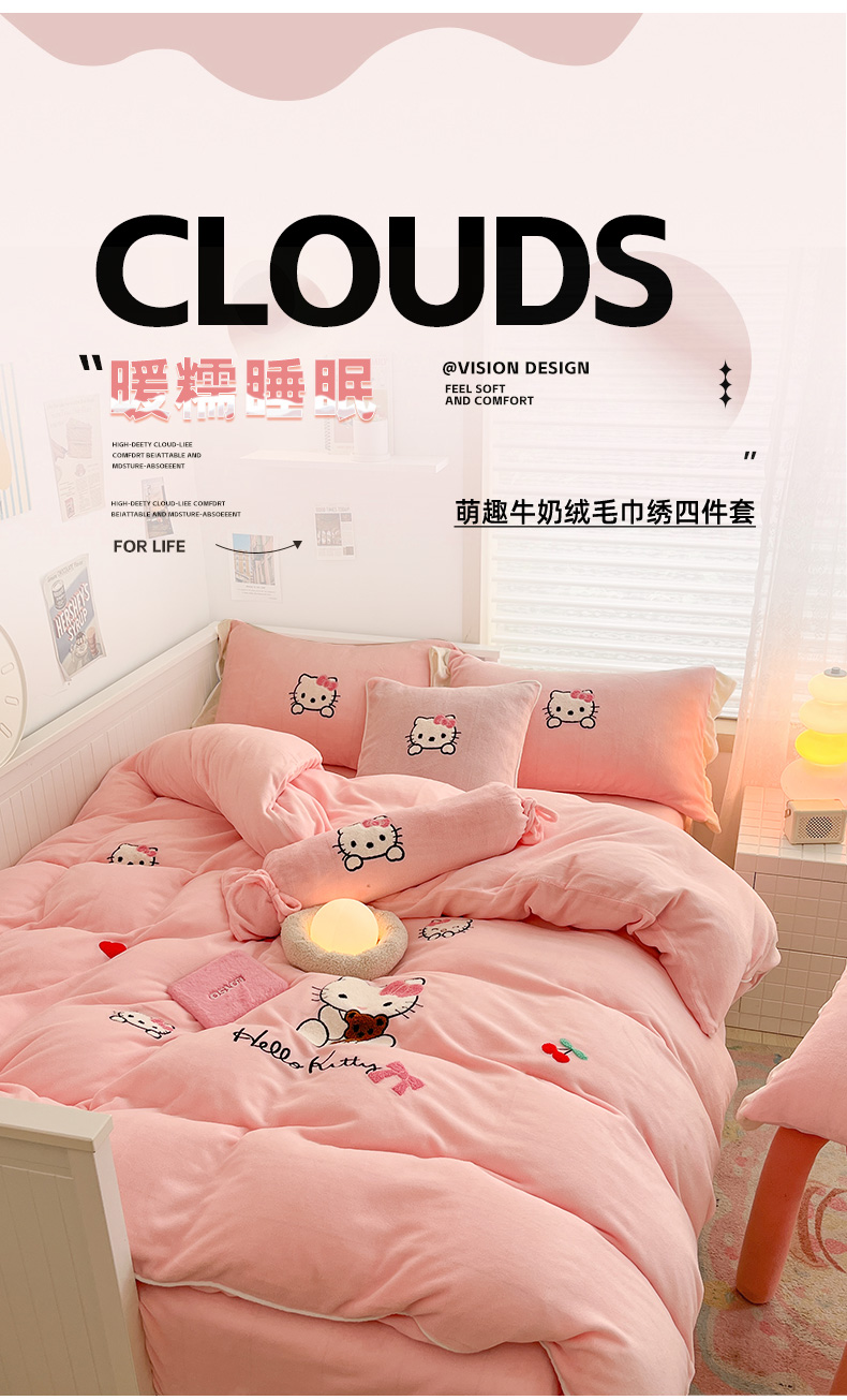 商品名称:丝印良品 2024秋冬卡通毛巾绣牛奶绒四件套 KT猫粉