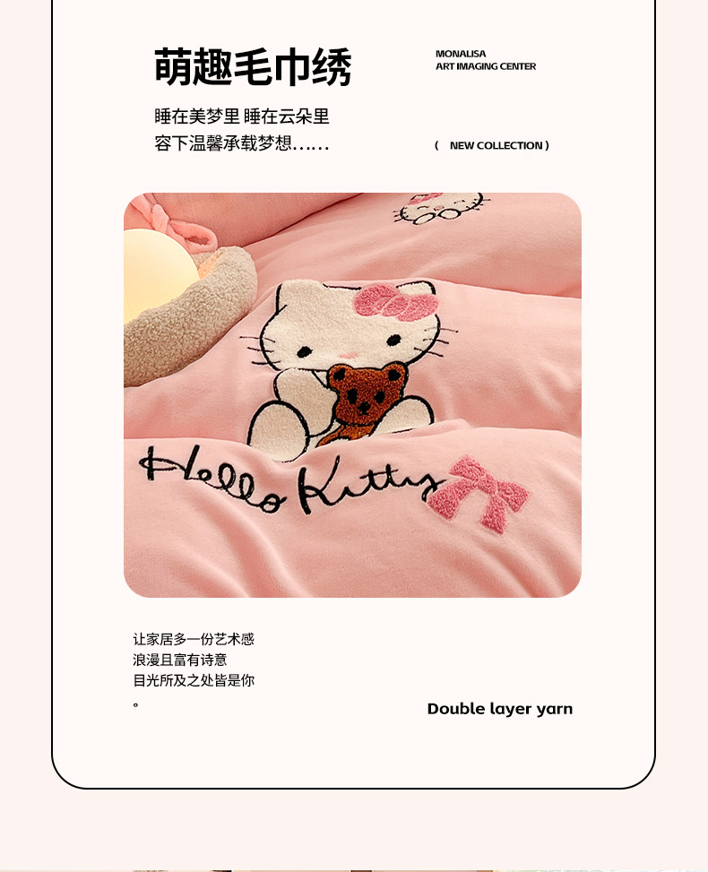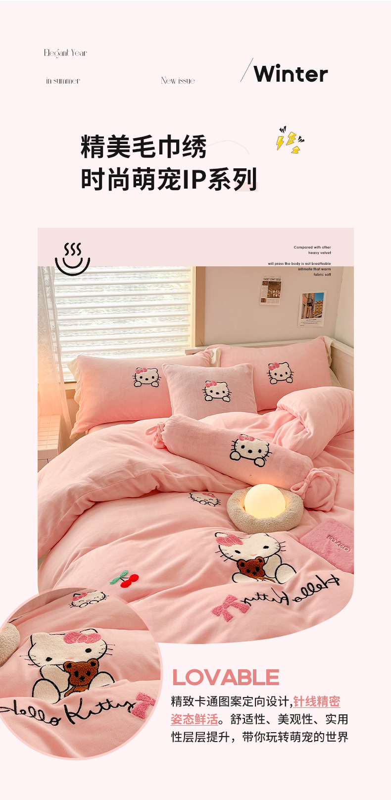 丝印良品 2024秋冬卡通毛巾绣牛奶绒四件套 KT猫粉