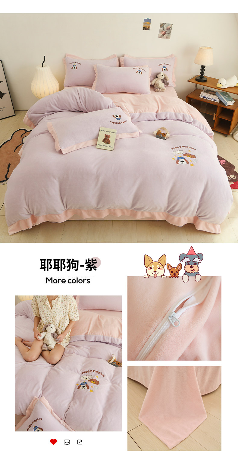 大渔生活 2025新款高克重卡通牛奶绒刺绣四件套--耶耶狗 耶耶狗-紫