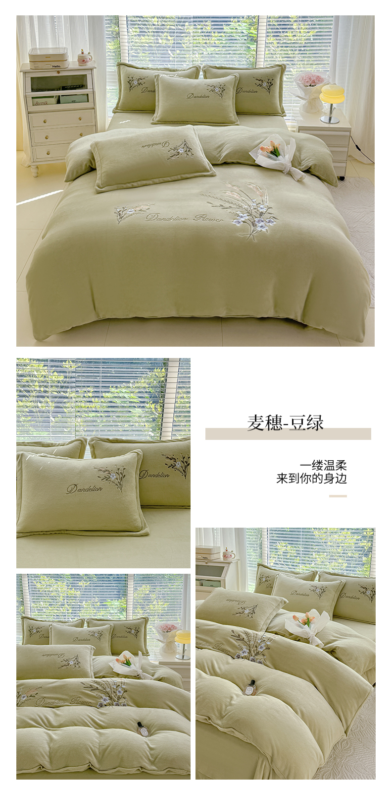 金米诺 2024新款绣花牛奶绒四件套-麦穗 麦穗-豆绿