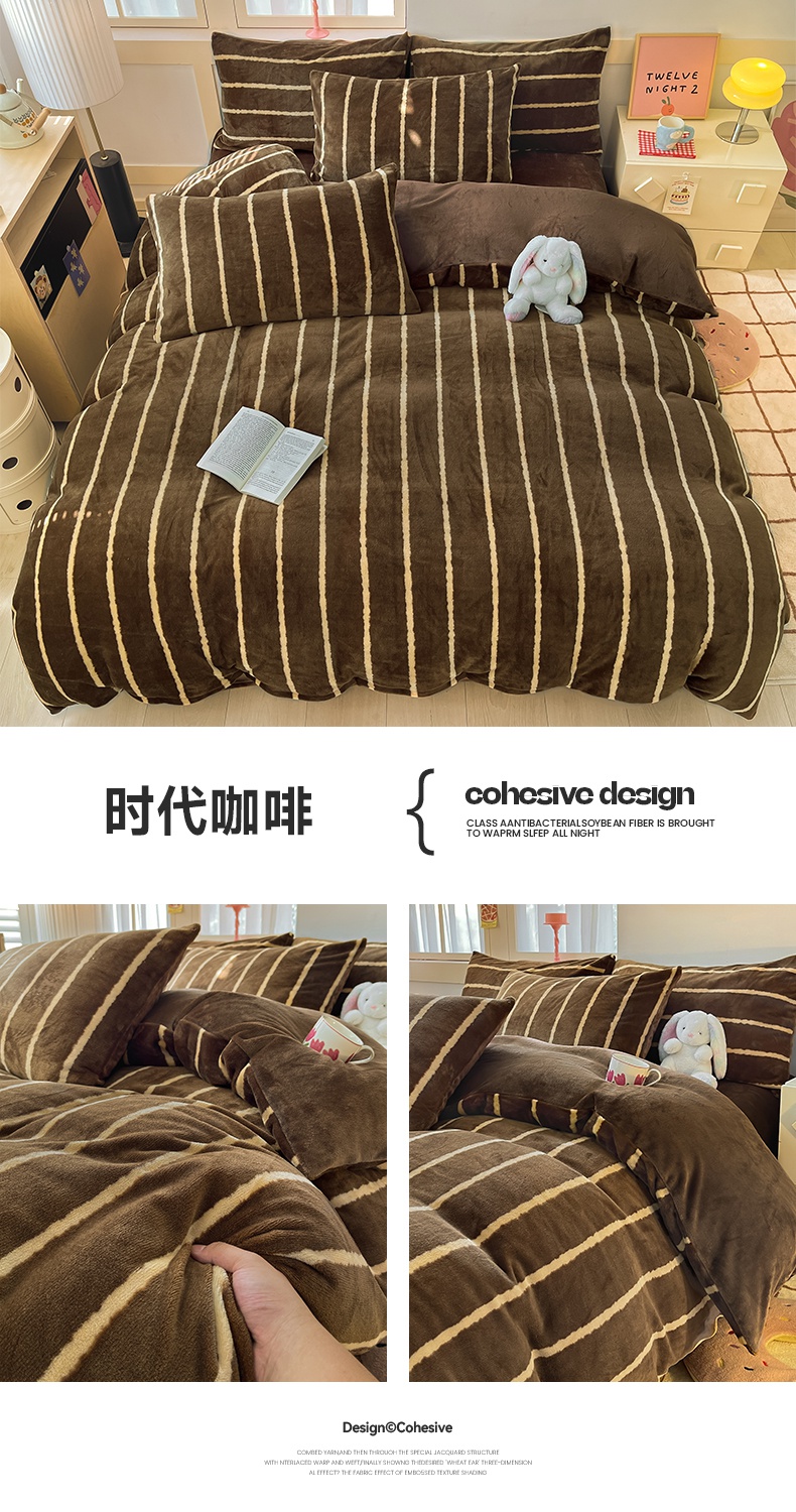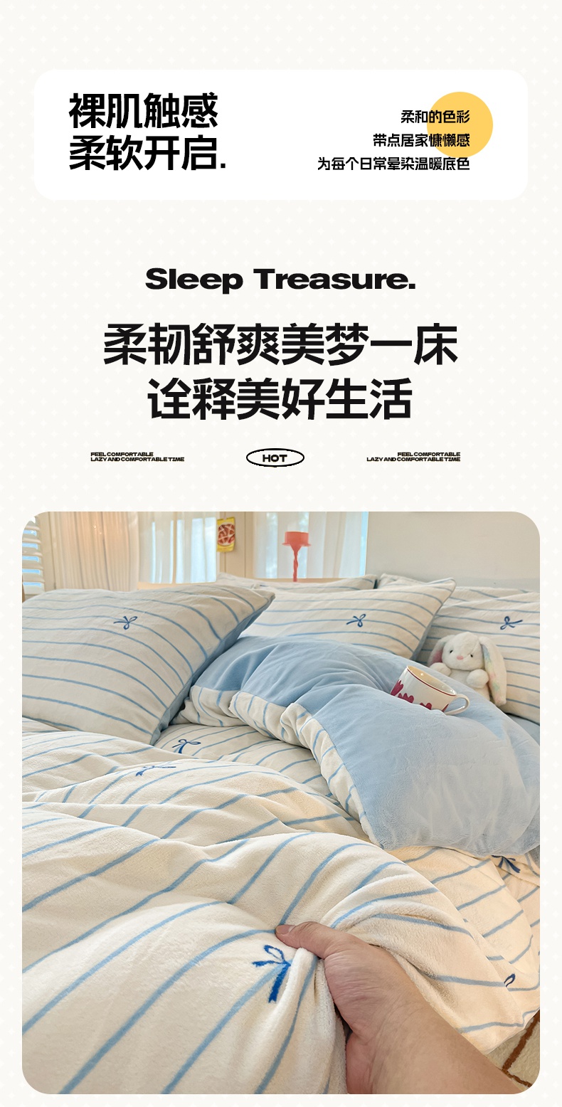 寐眠 2024新款高克重印花牛奶绒四件套条纹风格一 浅灰蝴蝶结