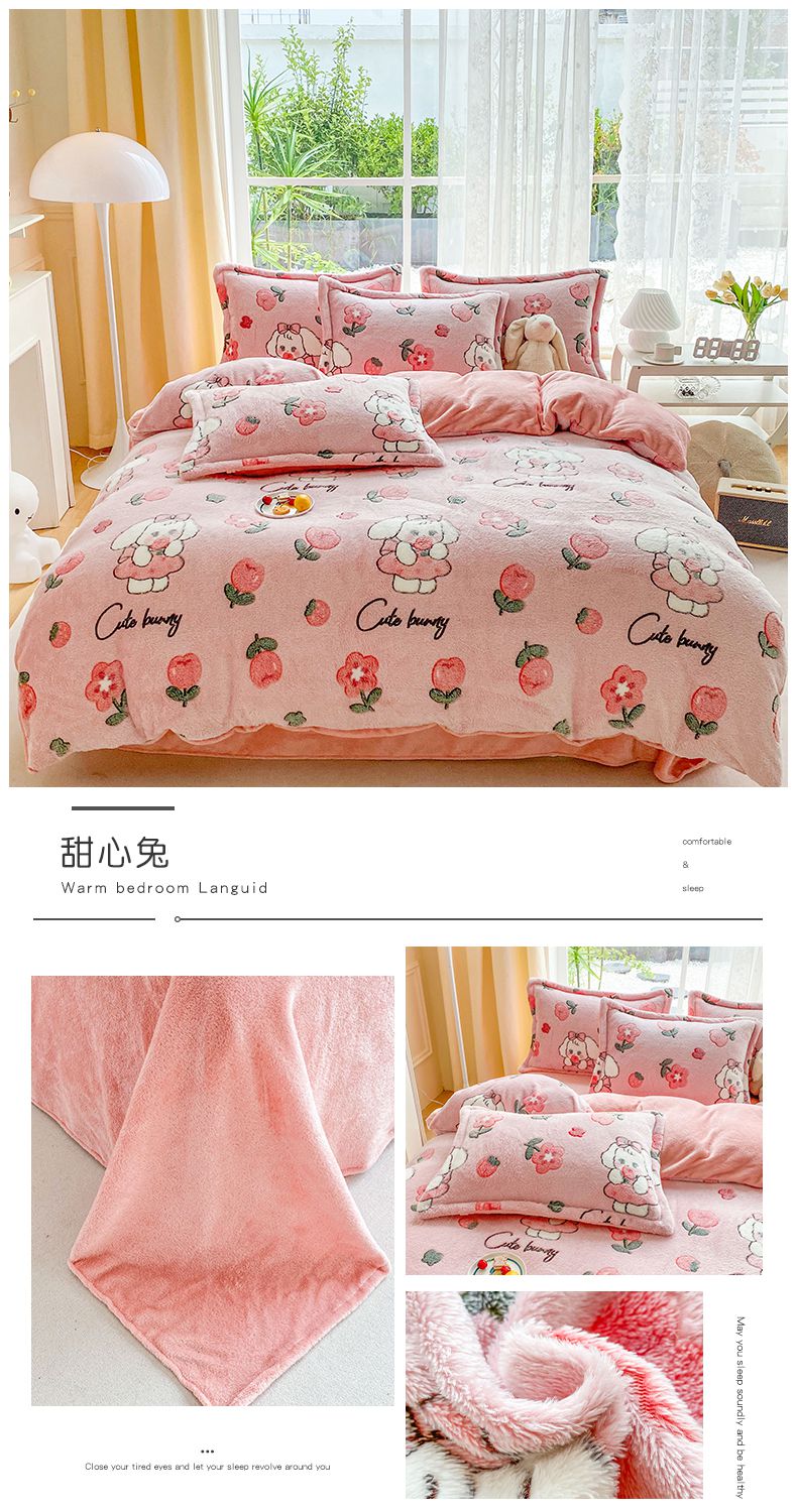 当前位置: 91家纺网 > 商品网购 > 床品套件 > 四件套 > 其它四件套 > 梵克保罗 2024秋冬新品立体雪花绒单被套牛奶绒法莱绒雕花绒兔毛卡通四件套学生三件套 草莓兔