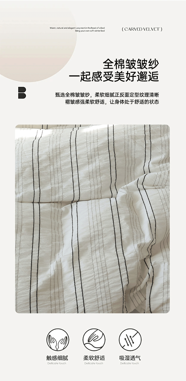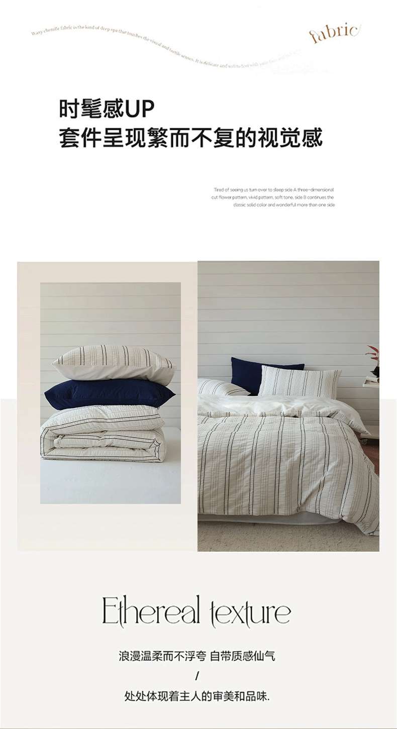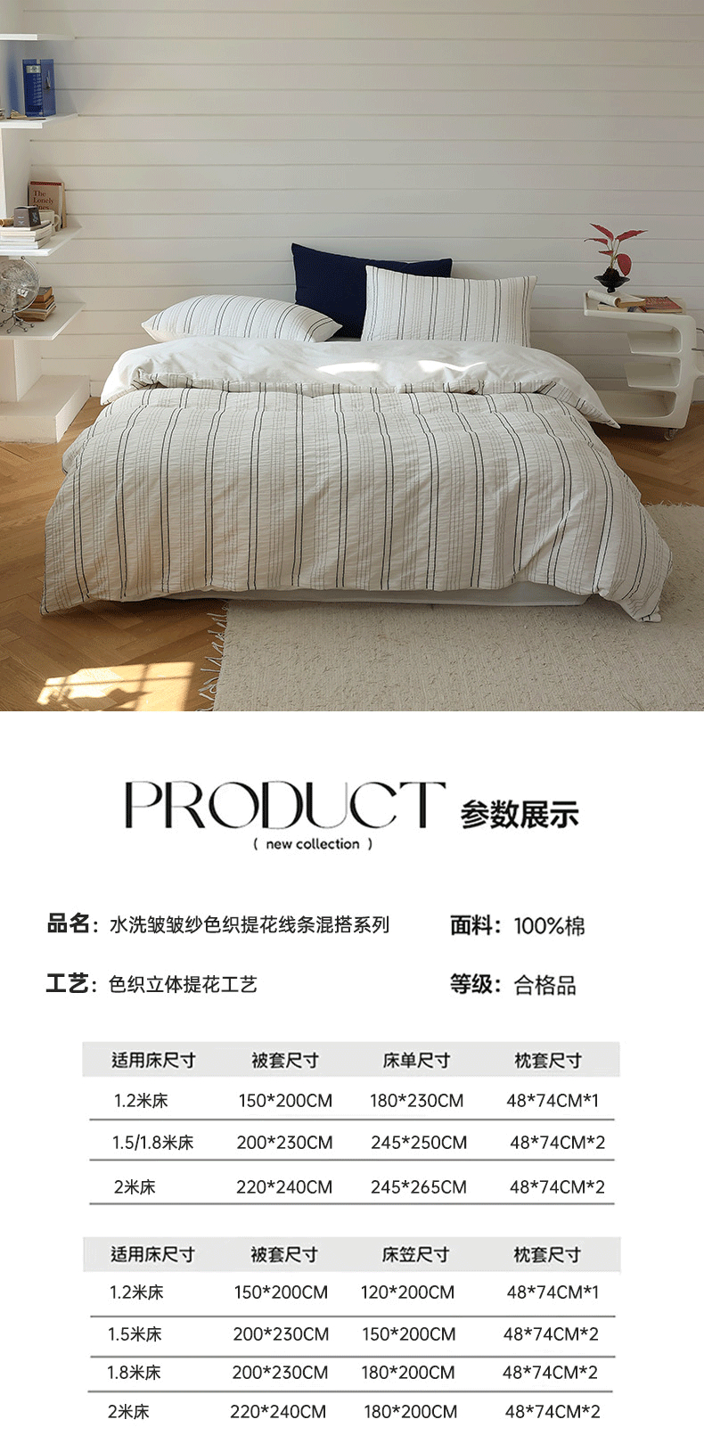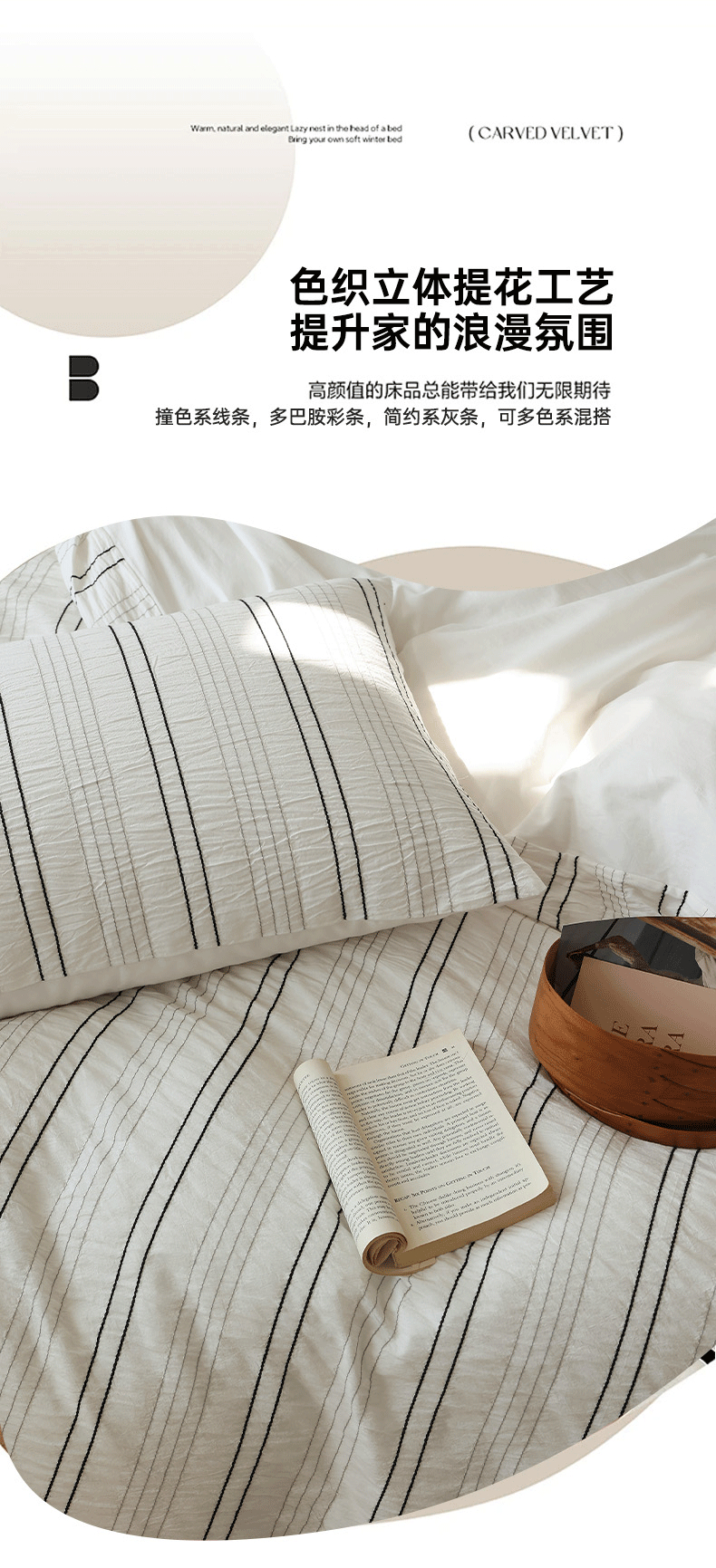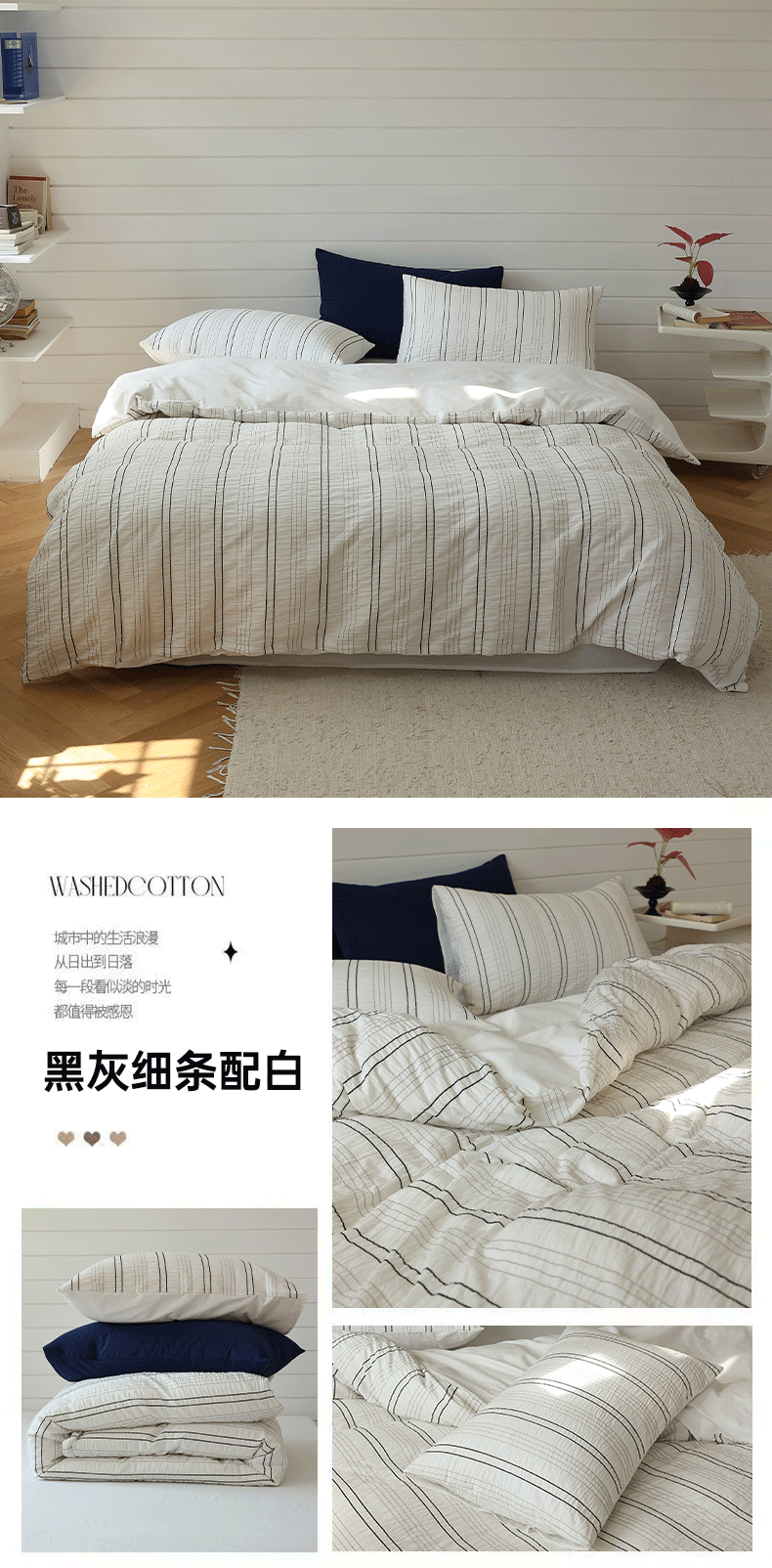 当前位置: 91家纺网 > 商品网购 > 床品套件 > 四件套 > 水洗棉四件套 > 棉眠 2024新款水洗皱皱纱色织提花线条混搭系列四件套 黑灰细条配白
