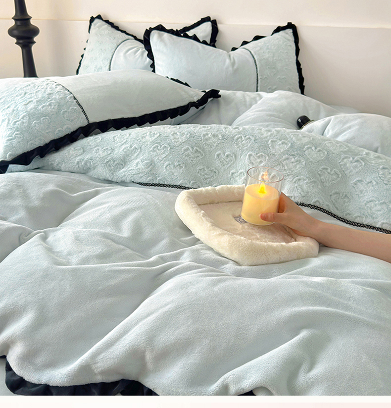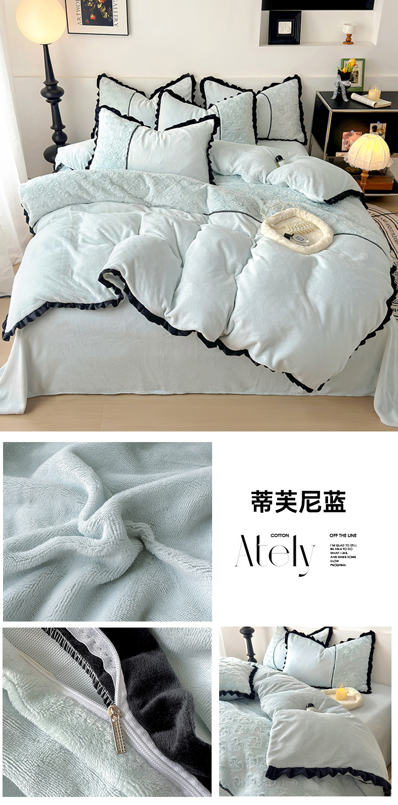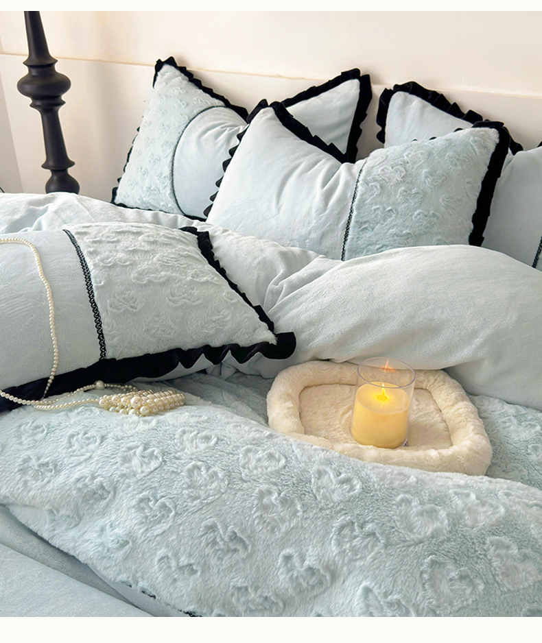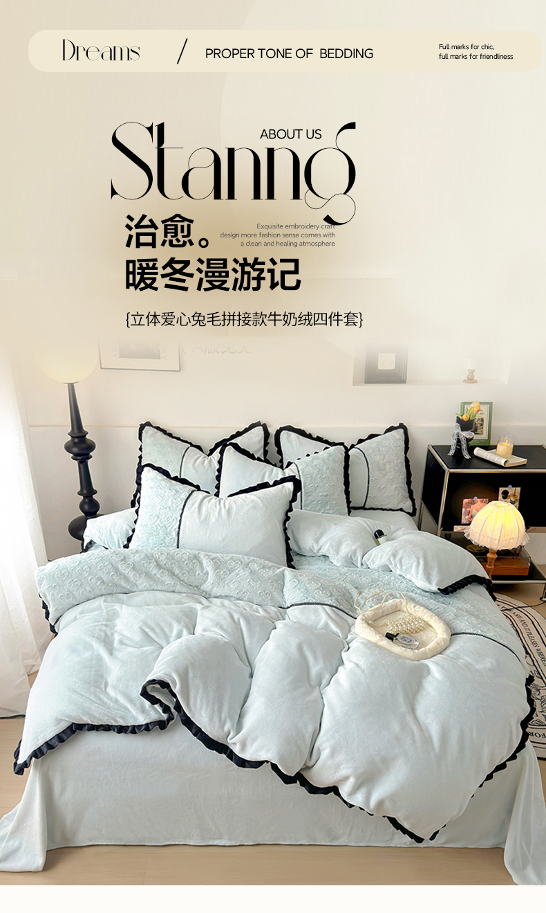 商品名称:春光里 2024新款立体爱心兔毛拼接款牛奶绒四件套 蒂芙尼蓝