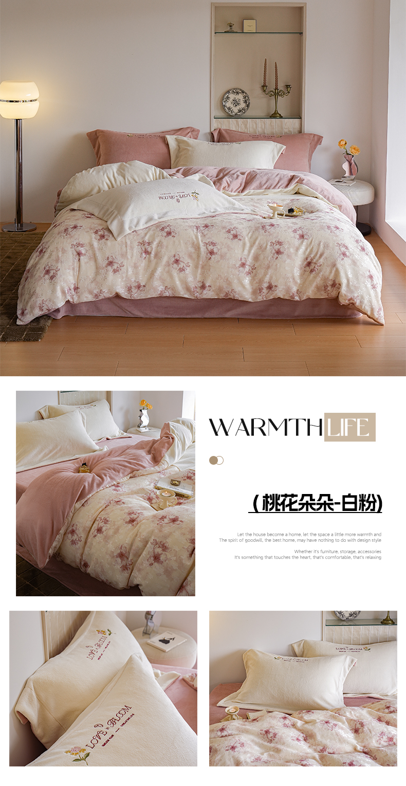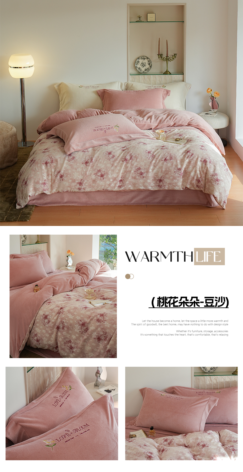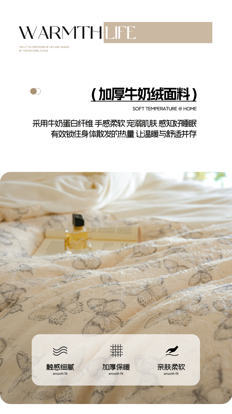 商品名称:秀色家纺 2025新款轻奢高级感牛奶绒床上四件套提花蝴蝶流苏保暖被套秋冬季加厚 桃花朵朵-浅棕