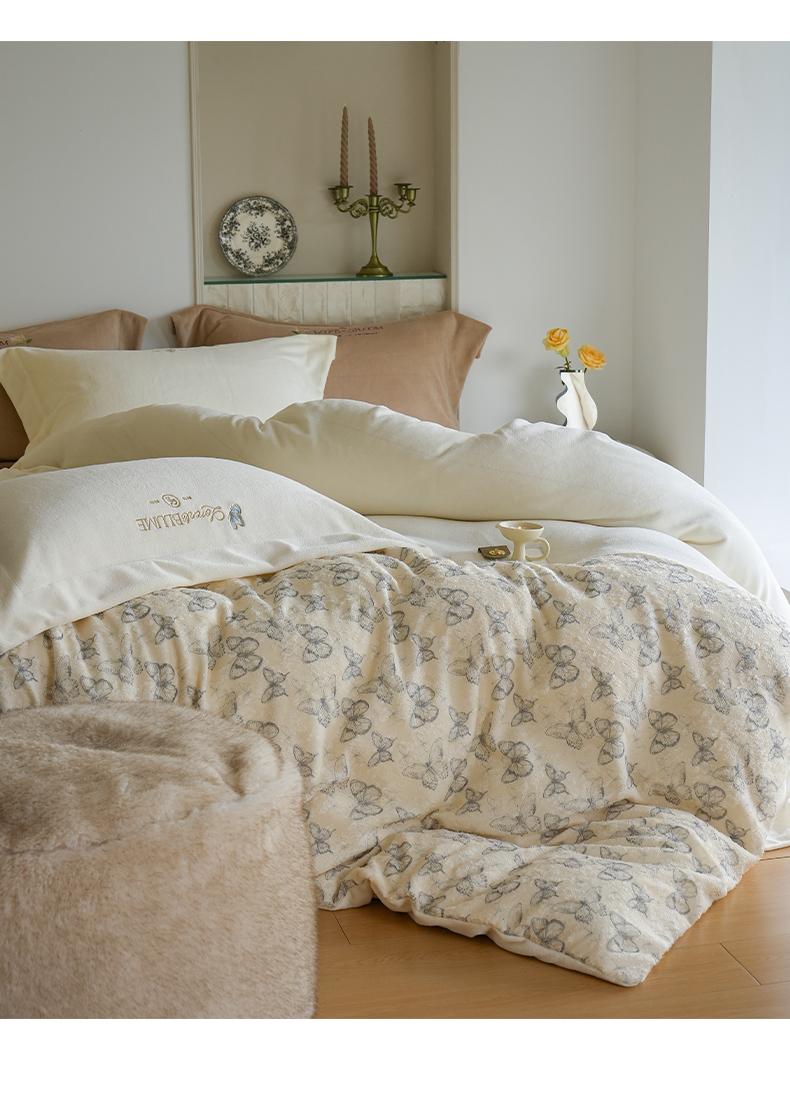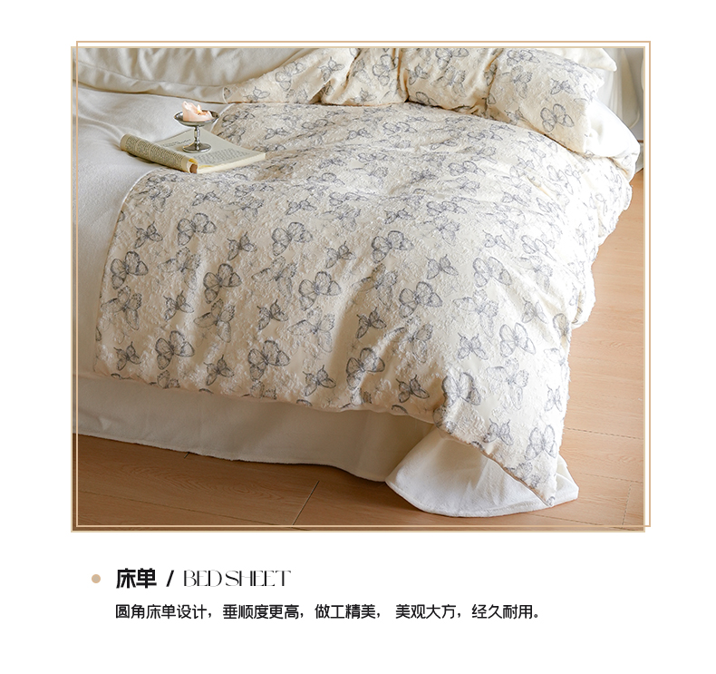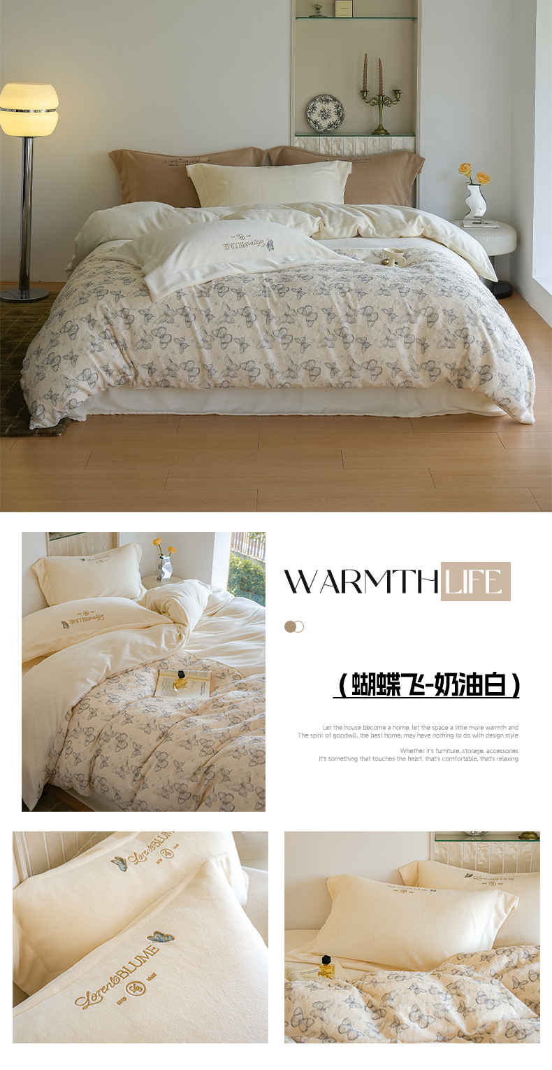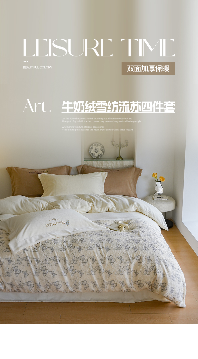 商品名称:秀色家纺 2025新款轻奢高级感牛奶绒床上四件套提花蝴蝶流苏保暖被套秋冬季加厚 桃花朵朵-浅棕