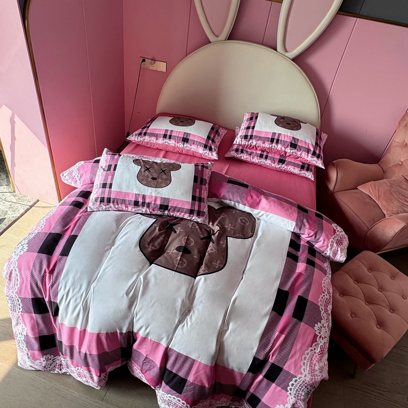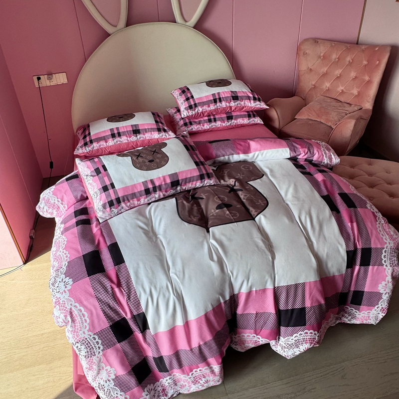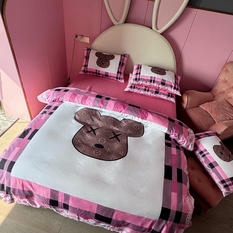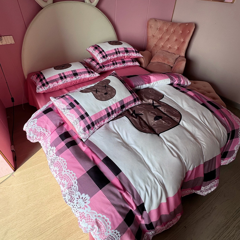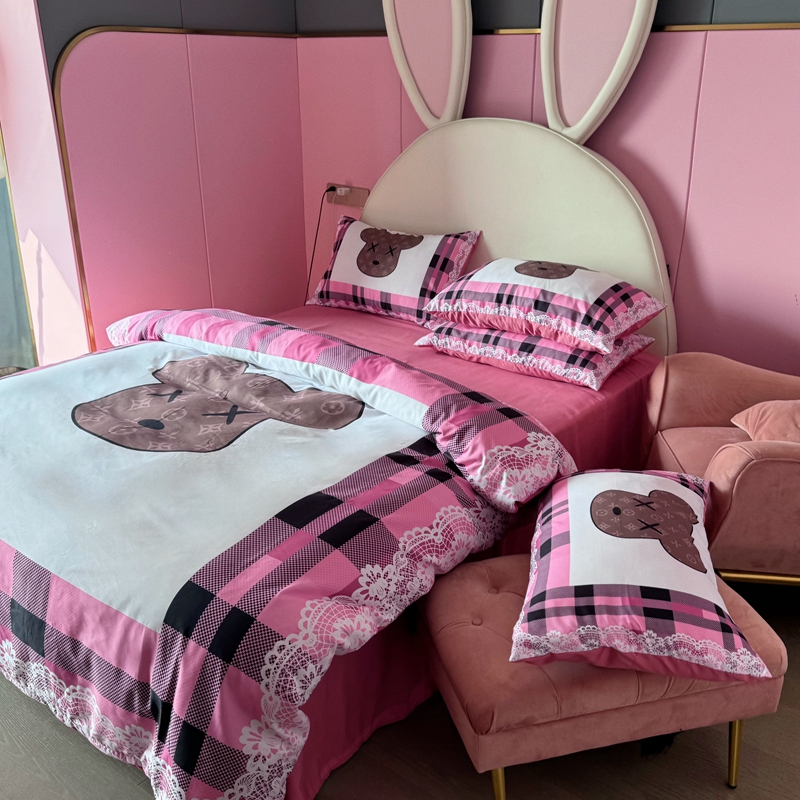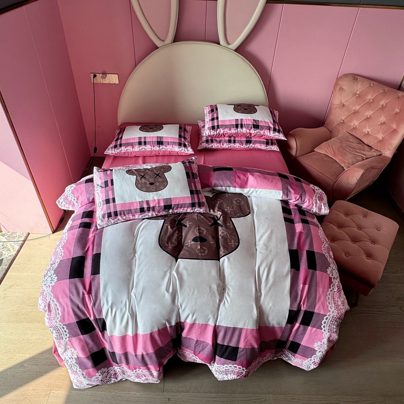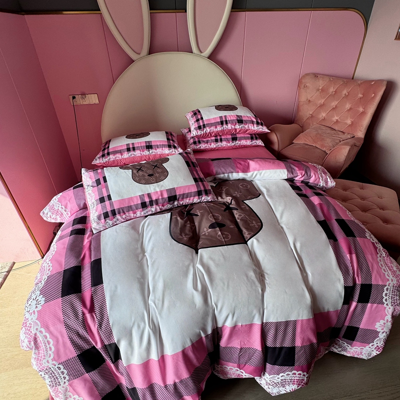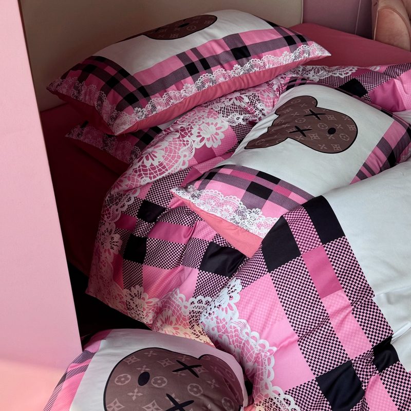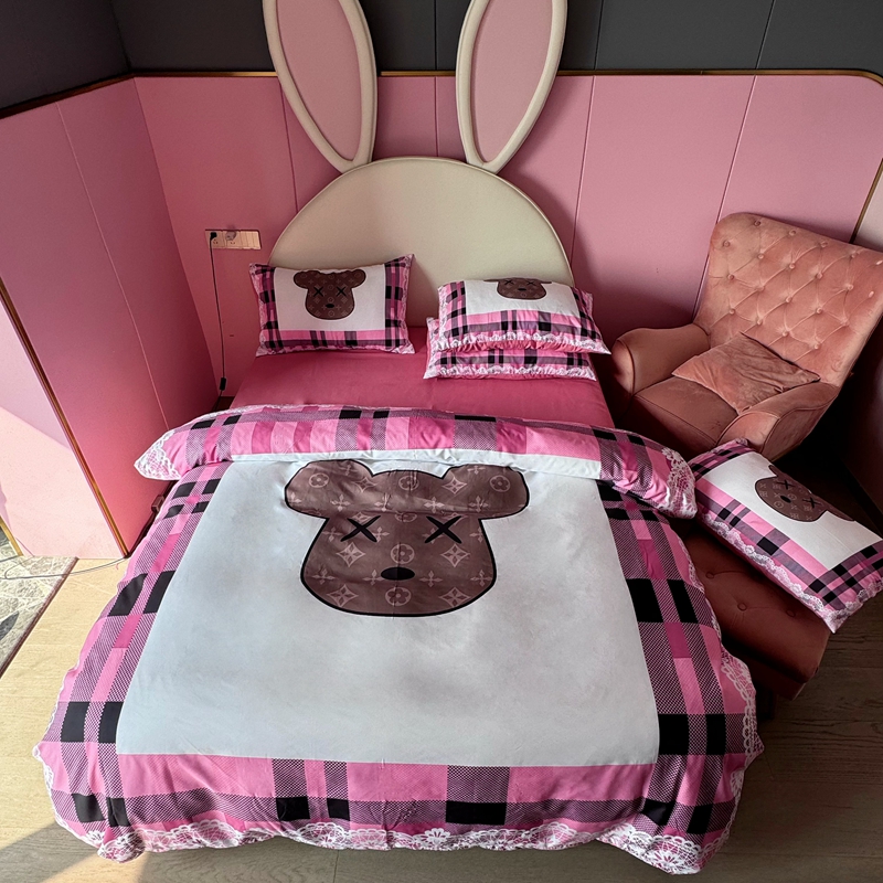 商品名称:色鬼布艺 2024新款双面磨毛数码印花四件套 磨毛白蕾丝粉格熊