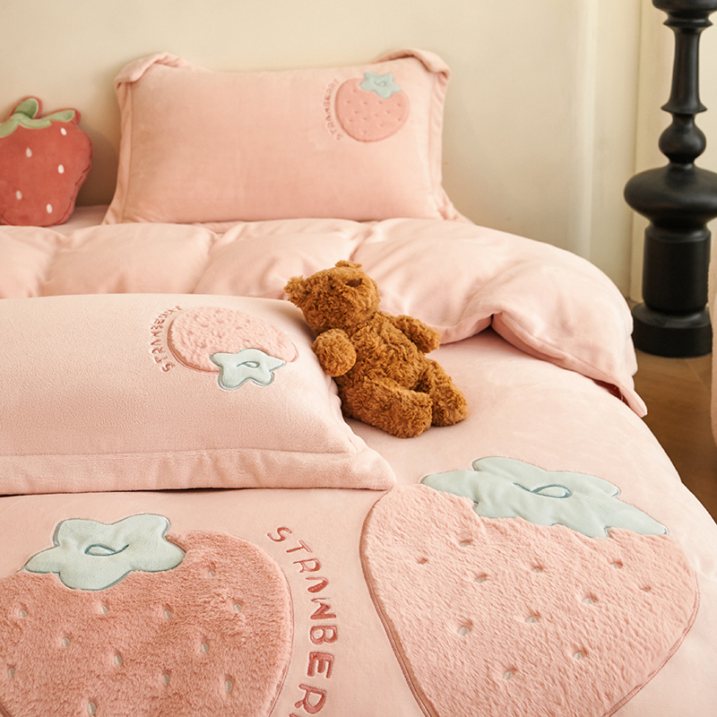 商品名称:黛舒家居 2024新款亲肤舒适高克重牛奶绒贴布绣四件套 甜心草莓粉
