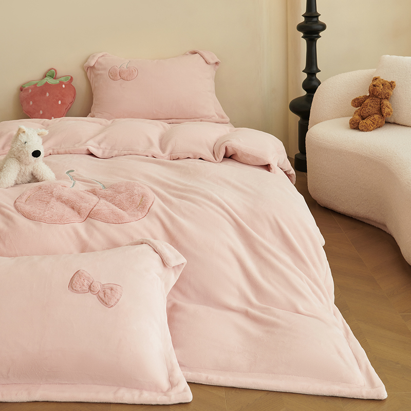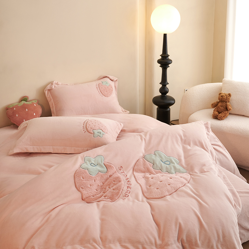 黛舒家居 2024新款亲肤舒适高克重牛奶绒贴布绣四件套 甜心草莓粉
