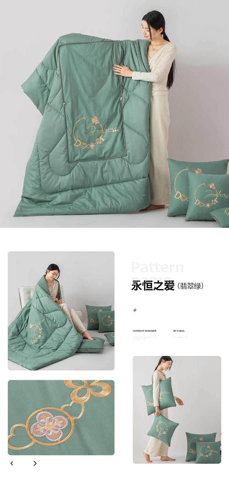 雷人家纺 2023新款全棉喷气13*72刺绣抱枕被 永恒之爱(翡翠绿)