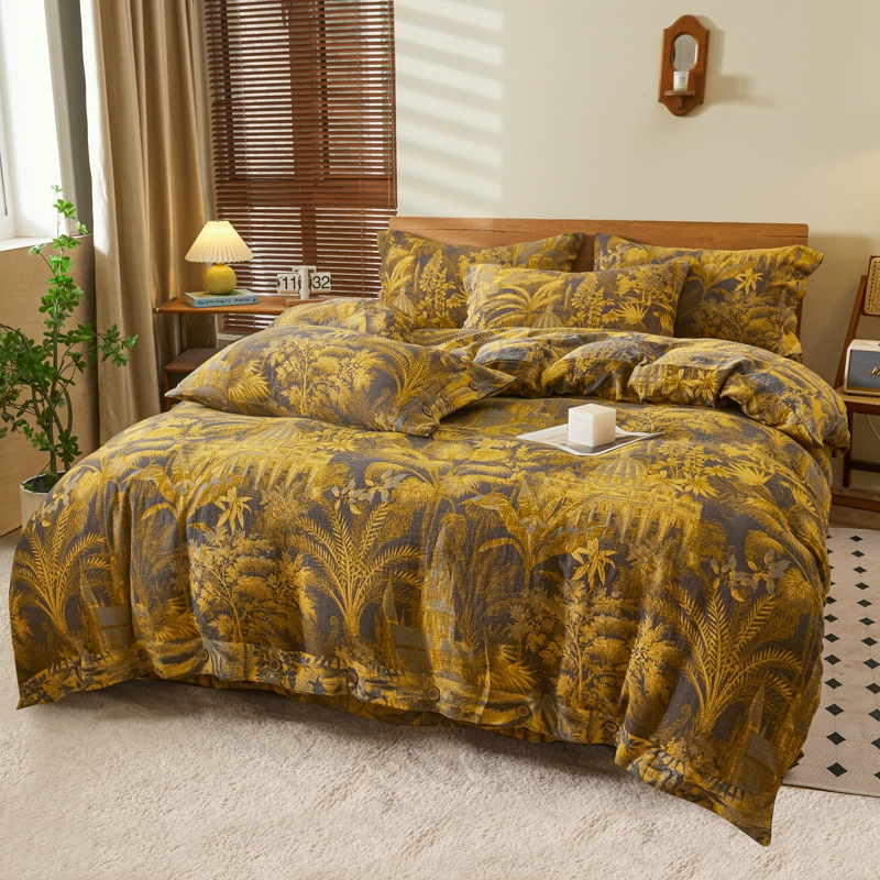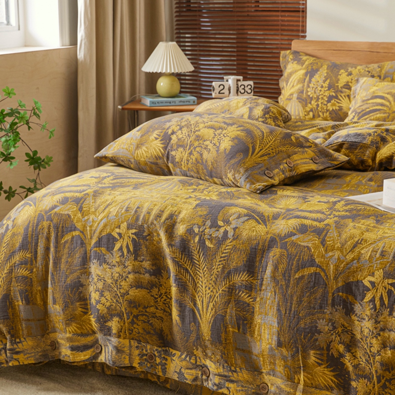 鲁爱 2025新款全棉色织双层纱纽扣款四件套 玉树琼林-灰黄