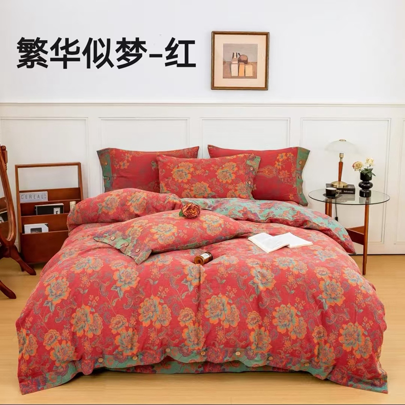 鲁爱 2025新款全棉色织双层纱纽扣款四件套 繁华似梦-红