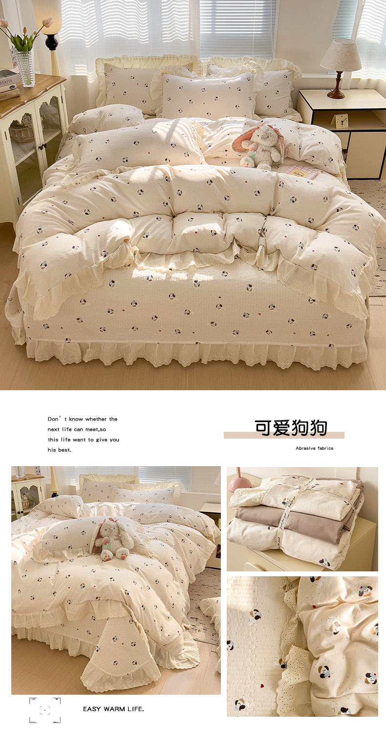 当前位置: 91家纺网 > 商品网购 > 床品套件 > 四件套 > 双层纱四件套 > 富米莱(原臻工厂) 2025新款A类针织双层纱花边款四件套床盖四件套 可爱狗狗