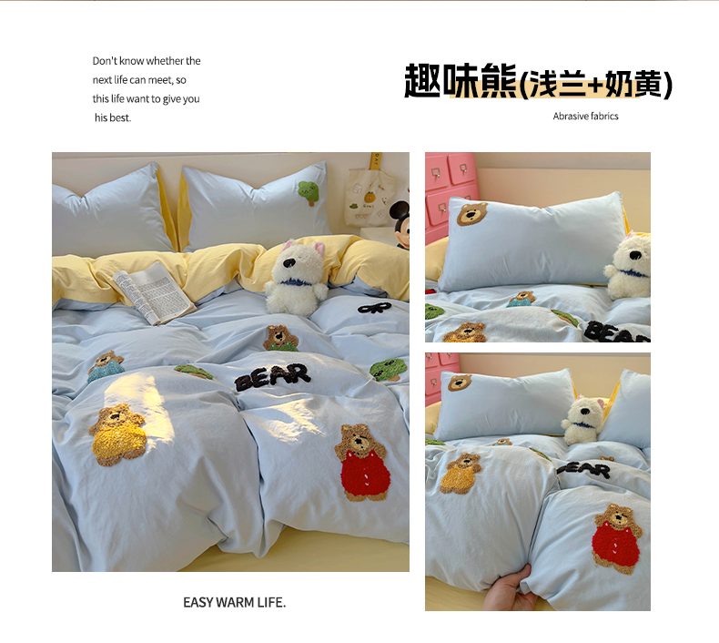 当前位置: 91家纺网 > 商品网购 > 床品套件 > 四件套 > 化纤普通四件套 > 易辰美 2025新款超柔水洗棉毛巾绣四件套 趣味熊(浅兰+奶黄)