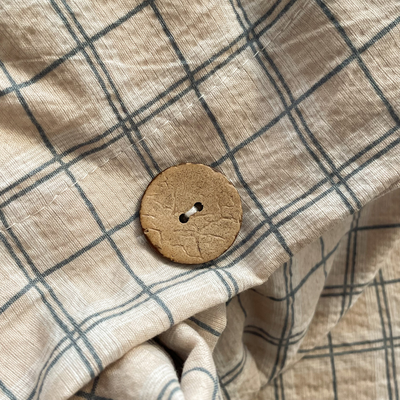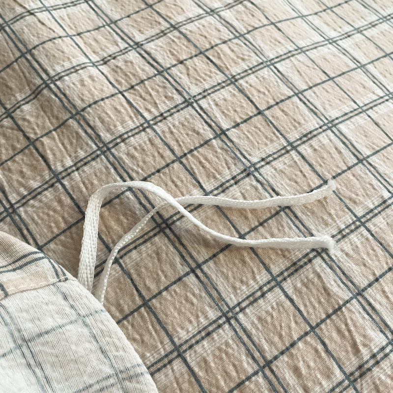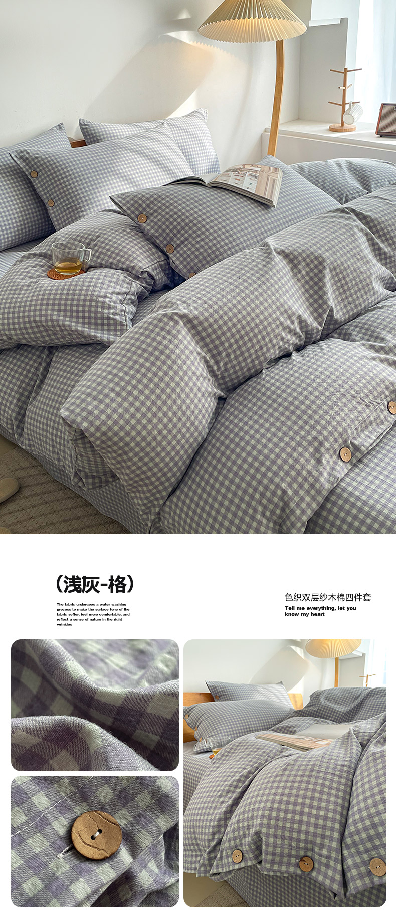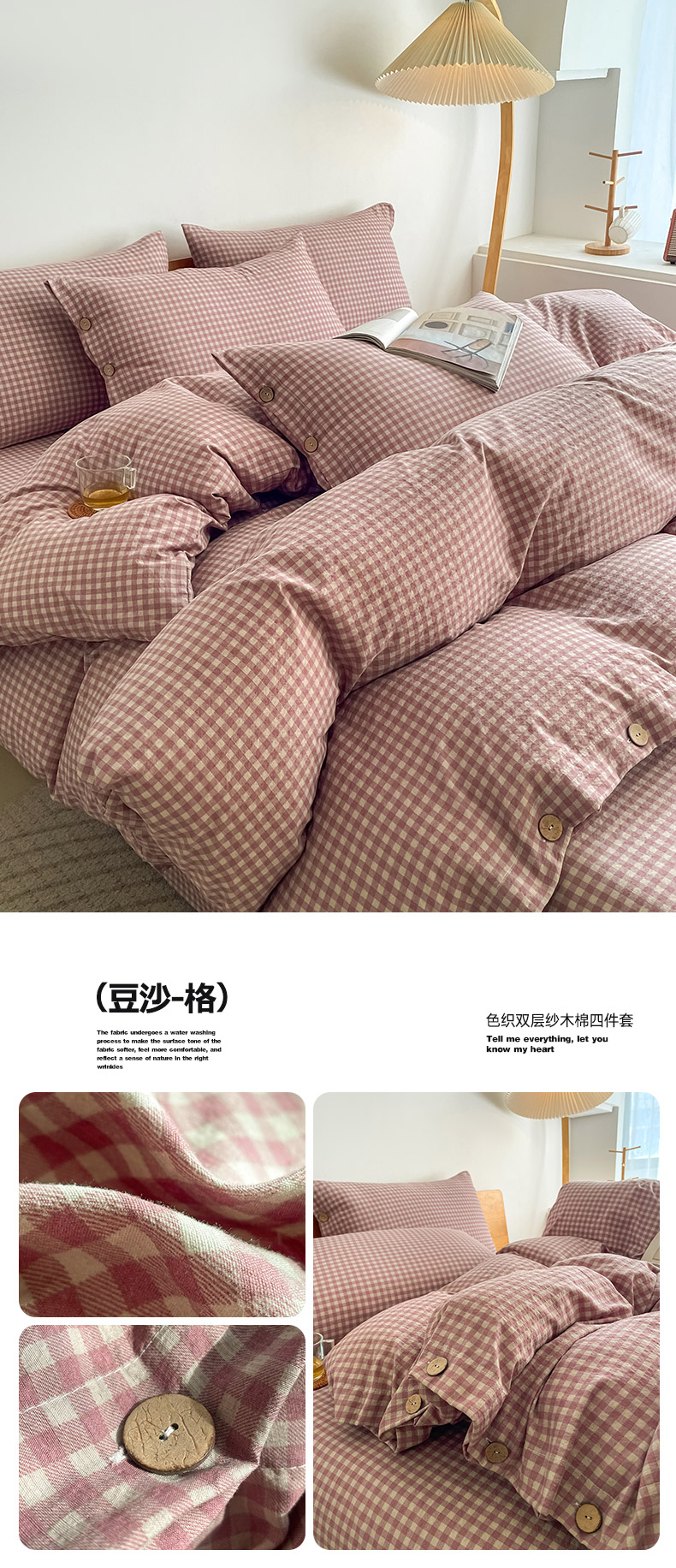 商品名称:库里梦 无印条纹简约格子色织双层纱木棉四件套 卡其-格