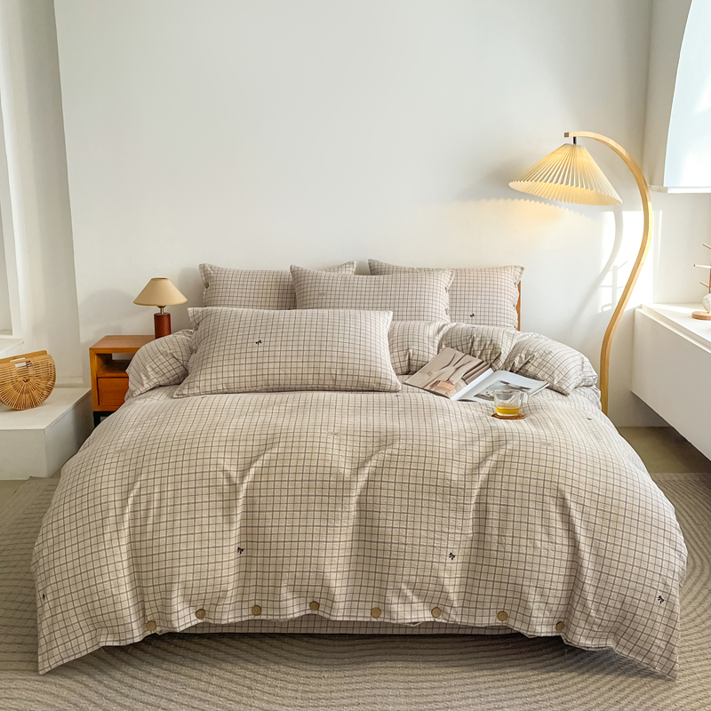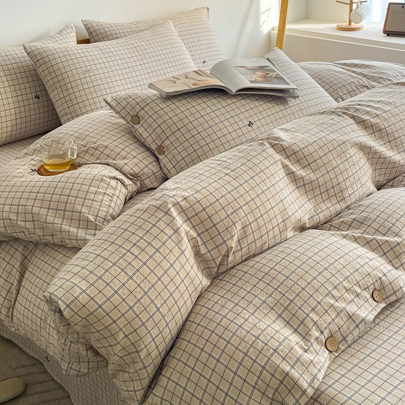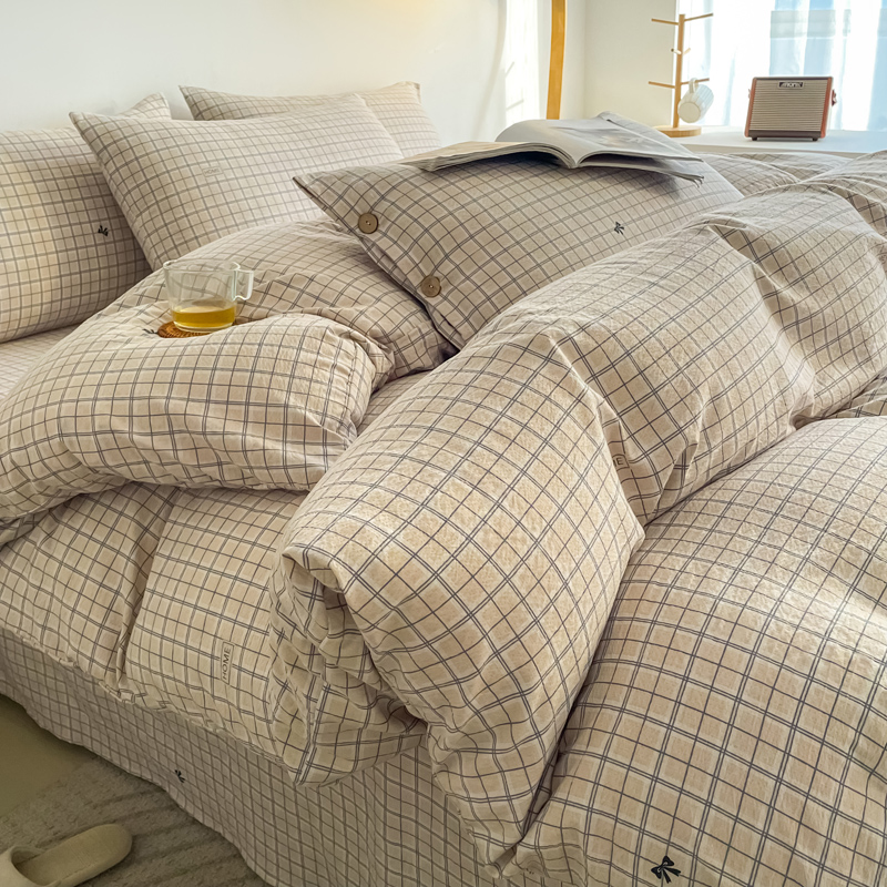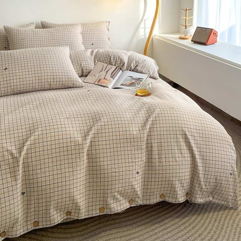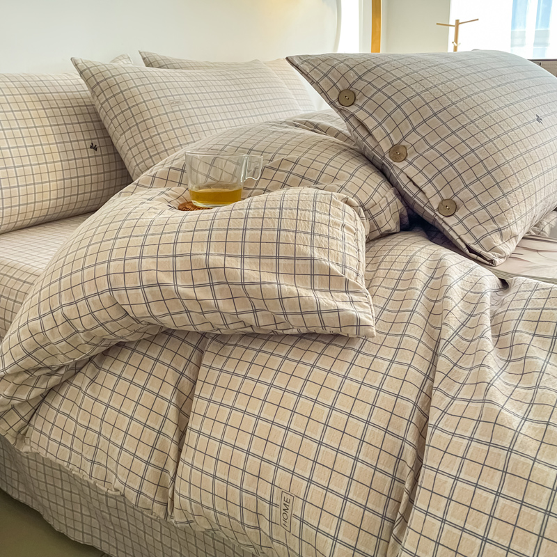 库里梦 无印条纹简约格子色织双层纱木棉四件套 卡其-格