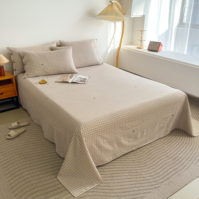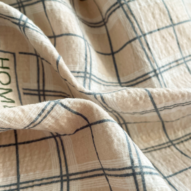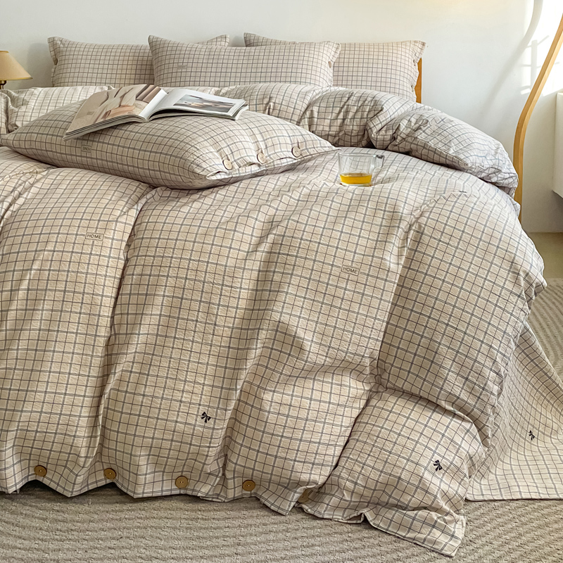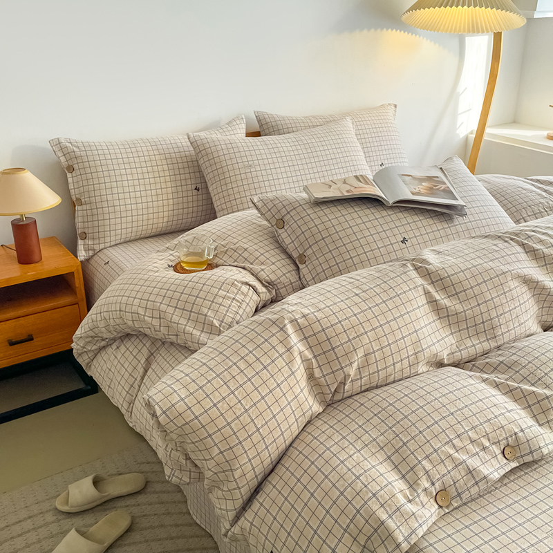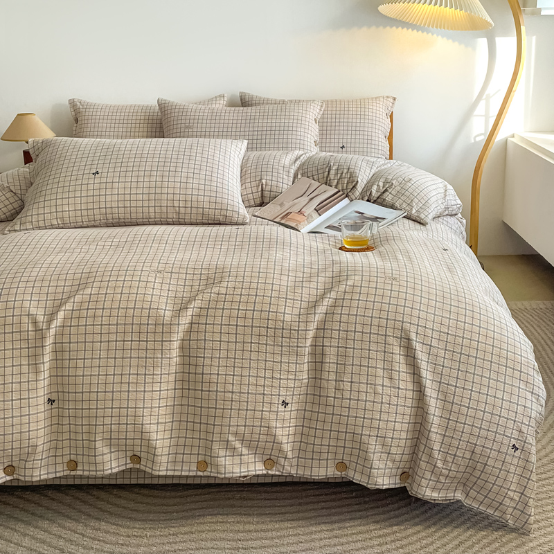 库里梦 无印条纹简约格子色织双层纱木棉四件套 卡其-格
