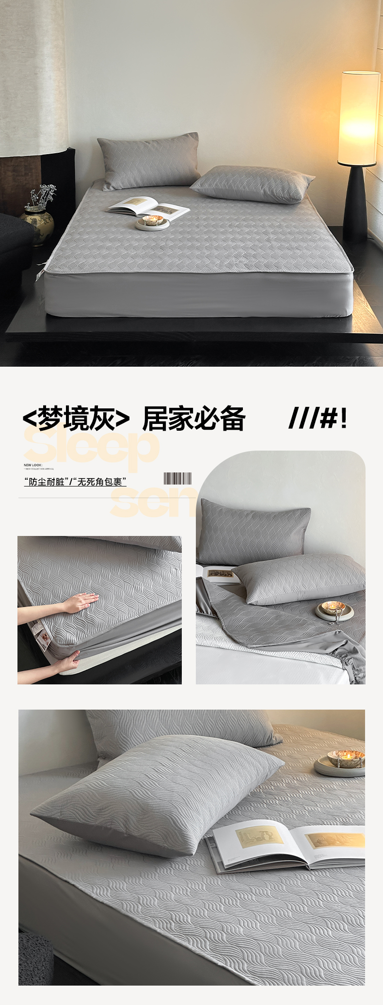 (总)三味舒屋 2026新款三防功能夹棉床笠床垫保护罩(严格控价:券后135/155/165),组合图仅供展示-不可下单,纯净白,净月白,净月灰,雅致灰