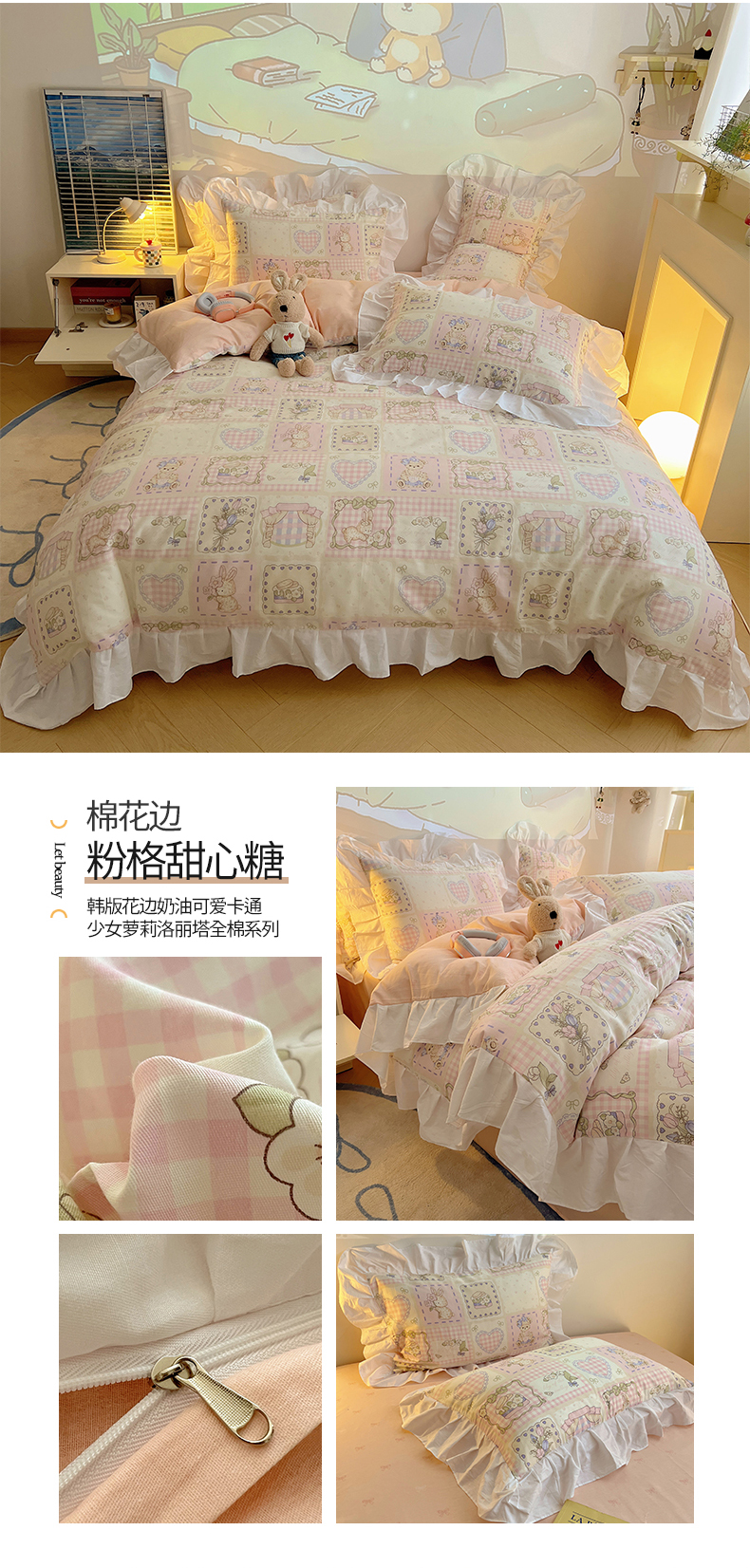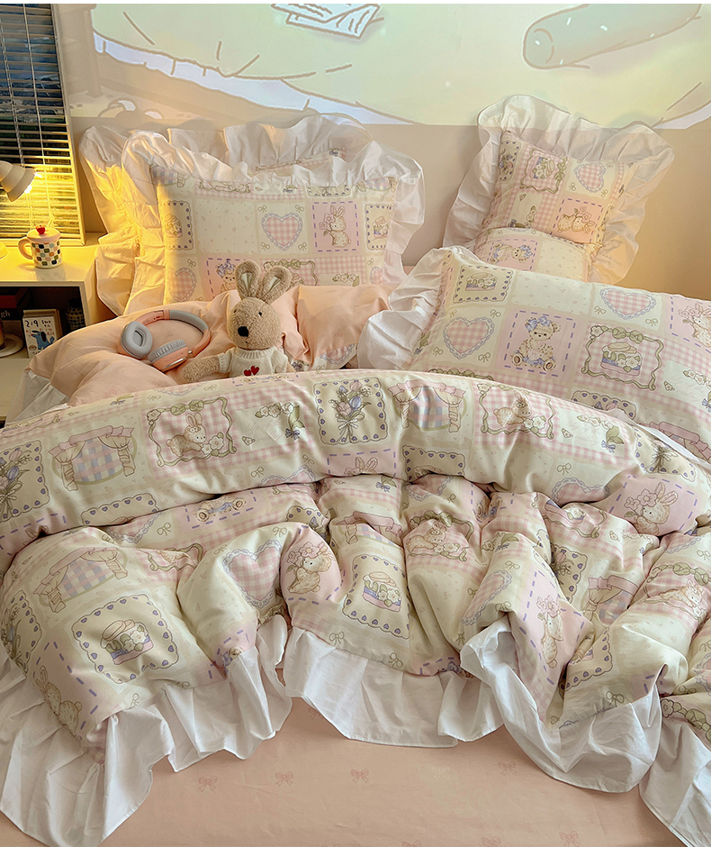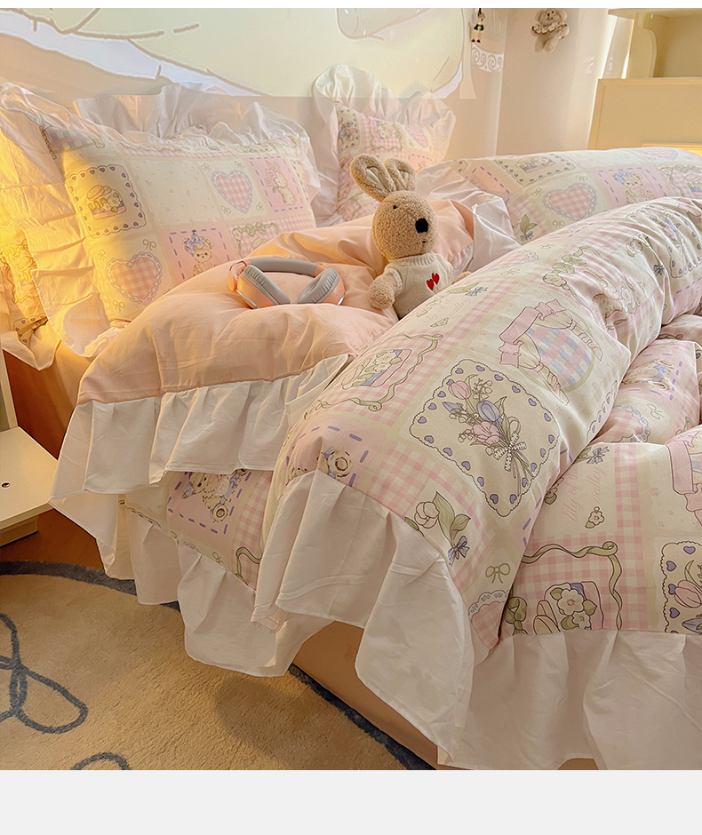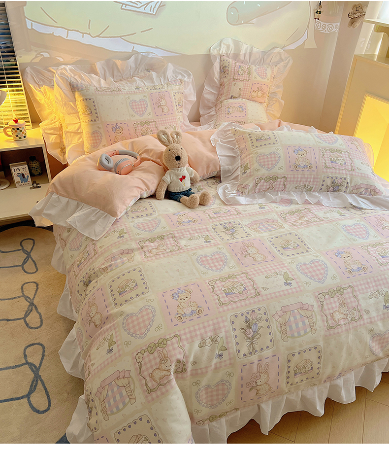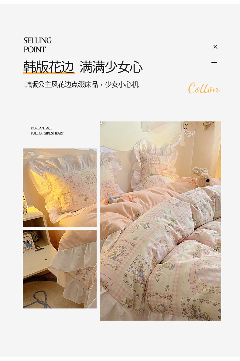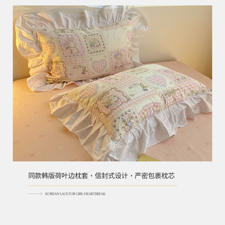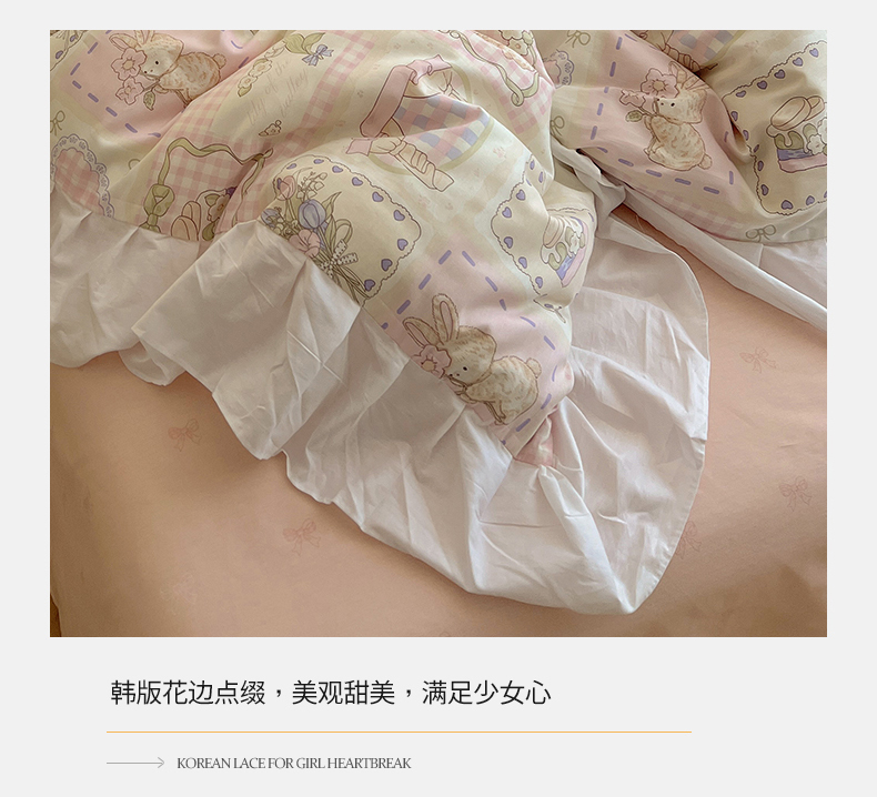 商品名称:2025纯棉韩版花边奶油可爱卡通少女萝莉洛丽塔系列全棉卡通四件套 棉花边-粉格甜心糖