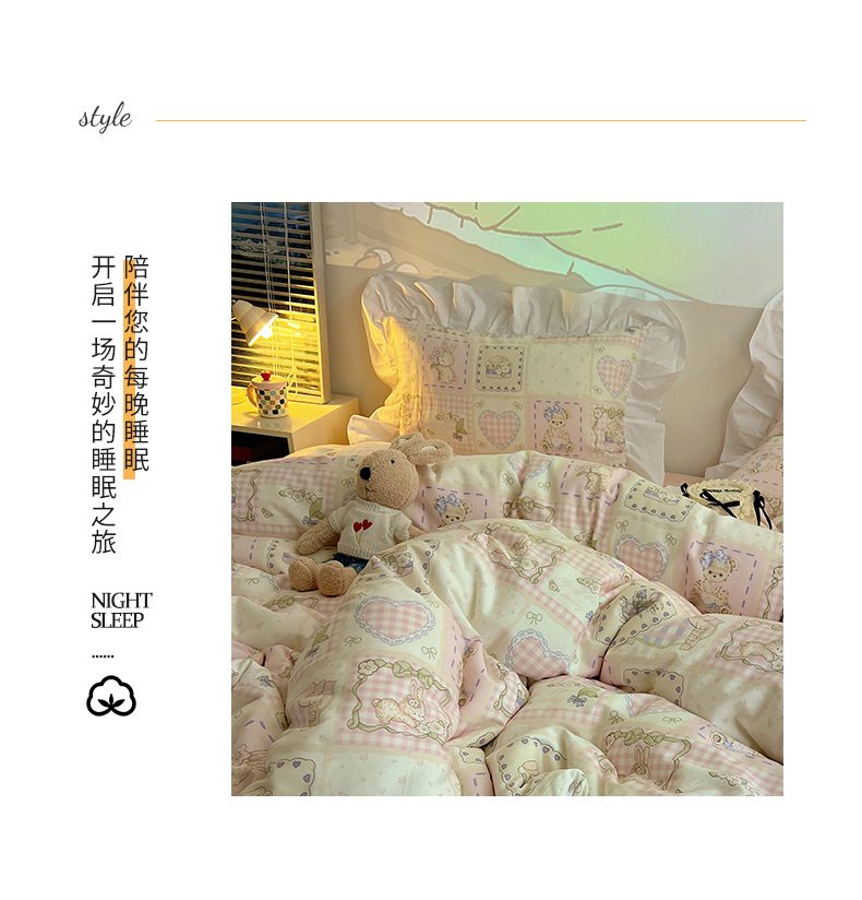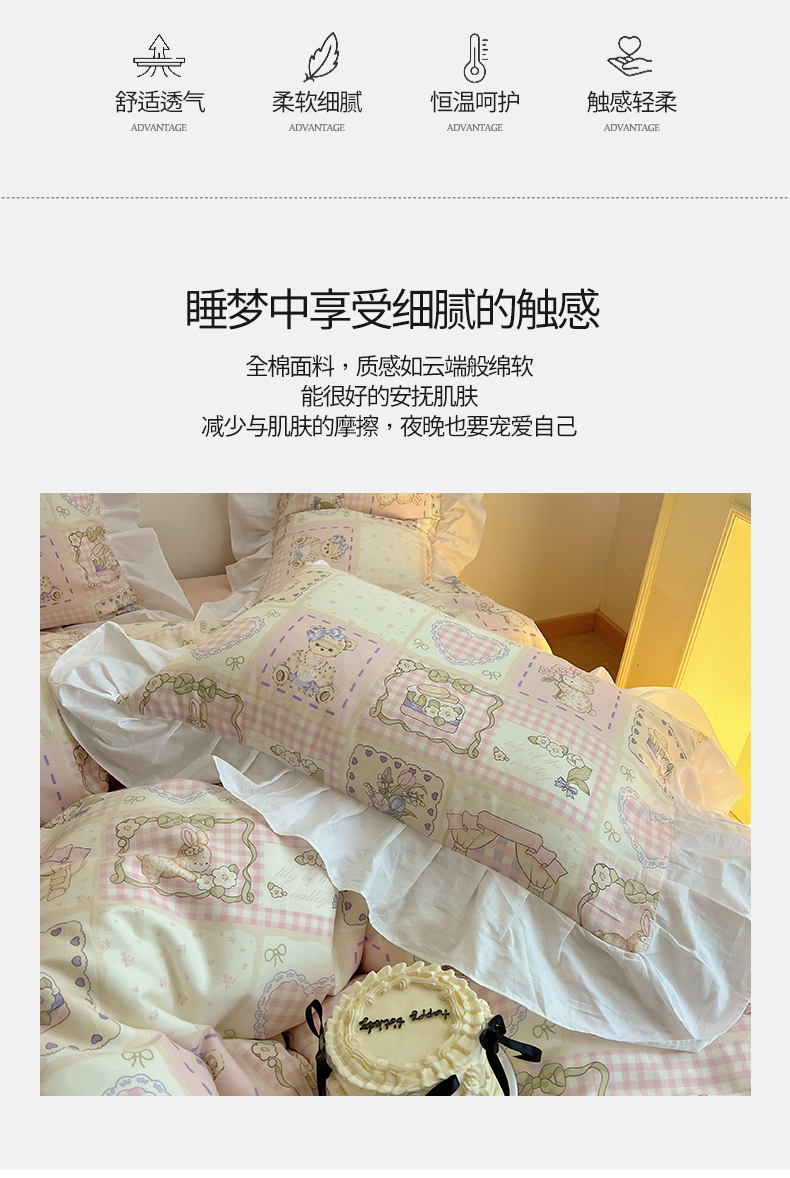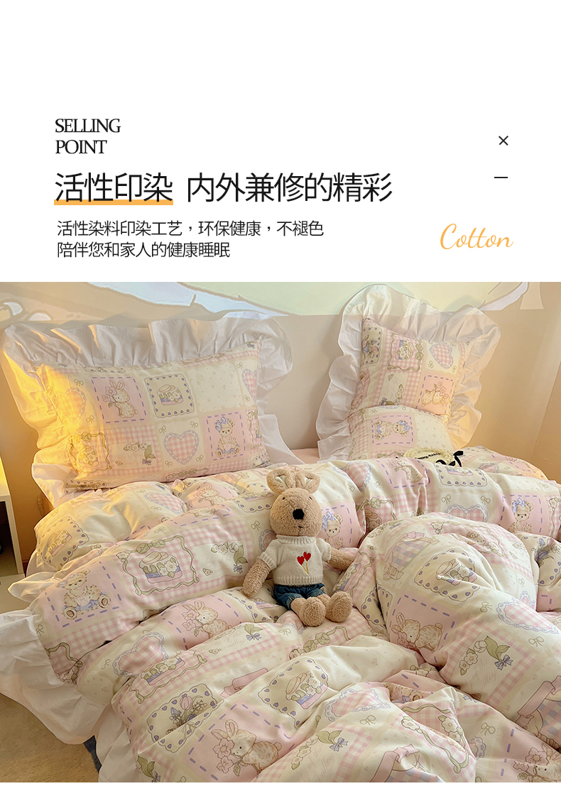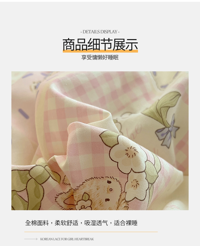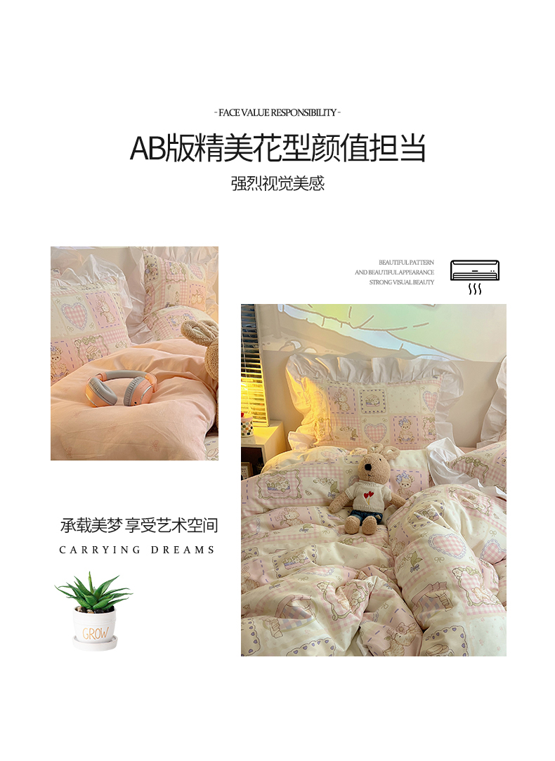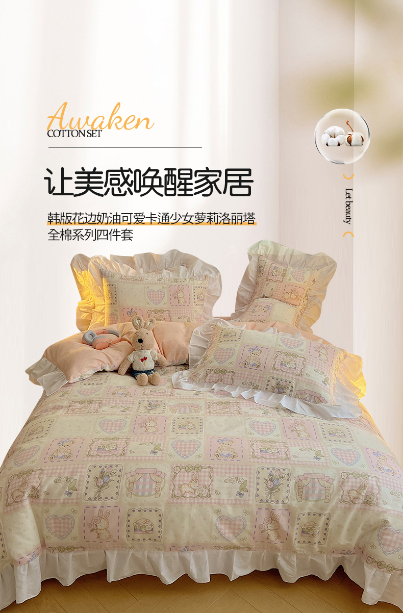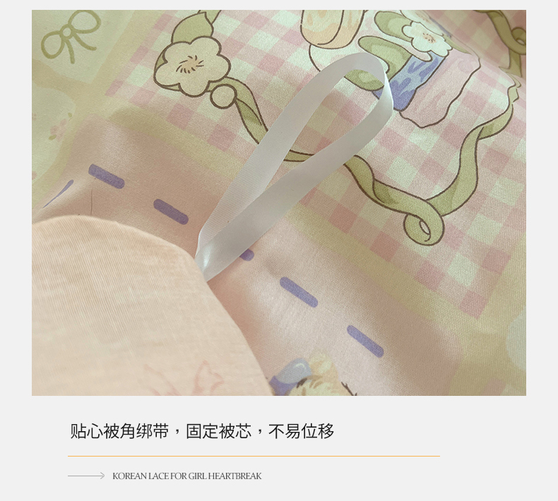 商品名称:2025纯棉韩版花边奶油可爱卡通少女萝莉洛丽塔系列全棉卡通四件套 棉花边-粉格甜心糖