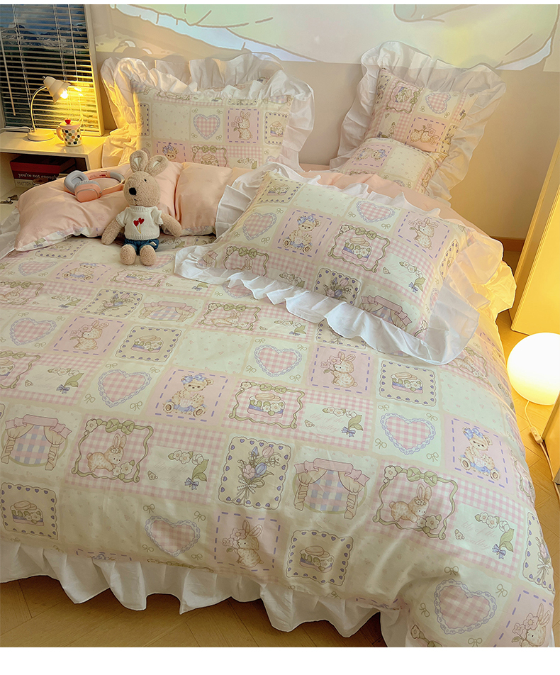 2025纯棉韩版花边奶油可爱卡通少女萝莉洛丽塔系列全棉卡通四件套 棉花边-粉格甜心糖