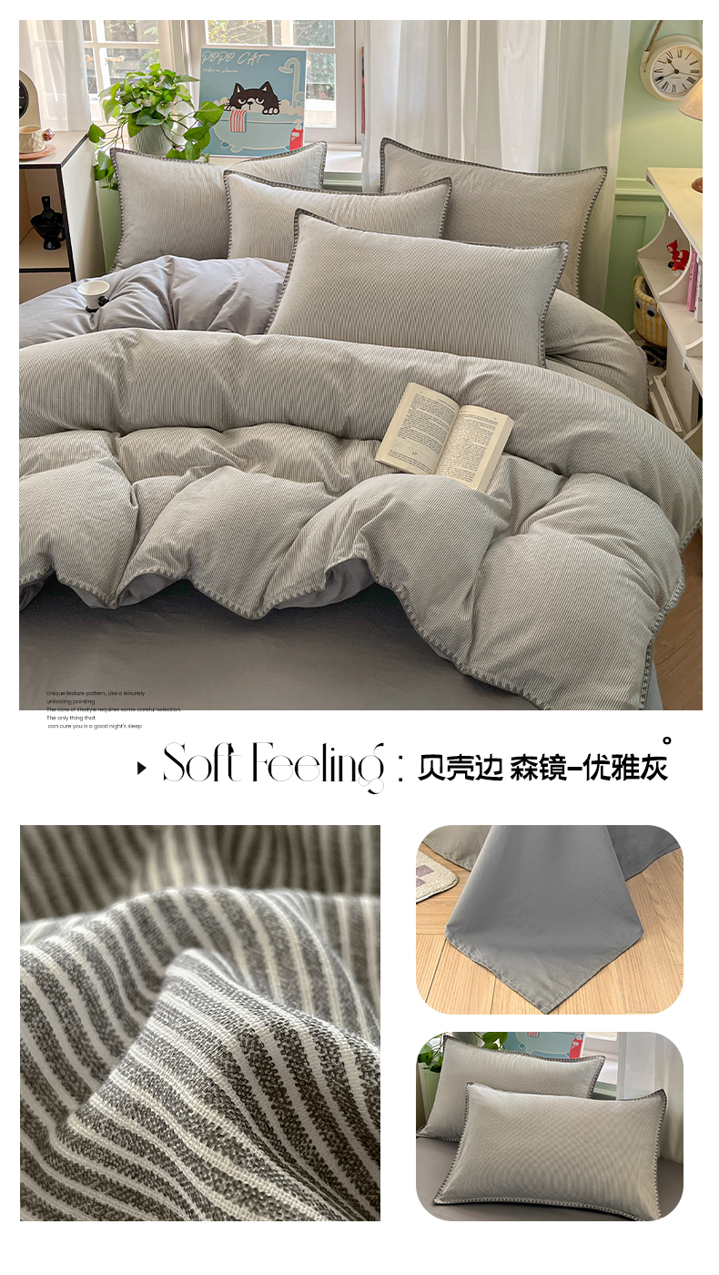 当前位置: 91家纺网 > 商品网购 > 床品套件 > 四件套 > 色织四件套 > 莱茵家居 2025春夏新款A类贝壳边刺绣双层纱全棉四件套 贝壳边 森镜-优雅灰