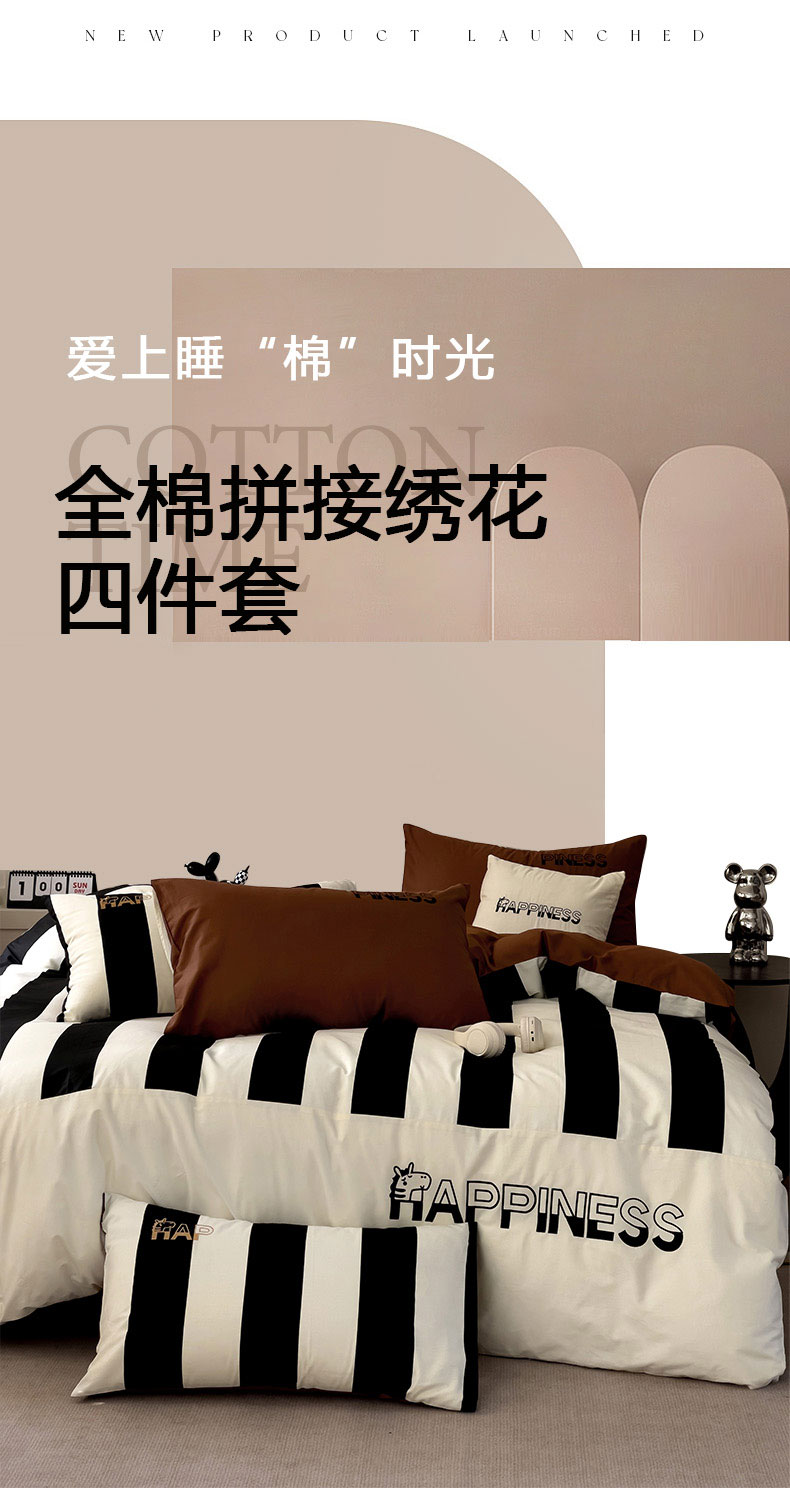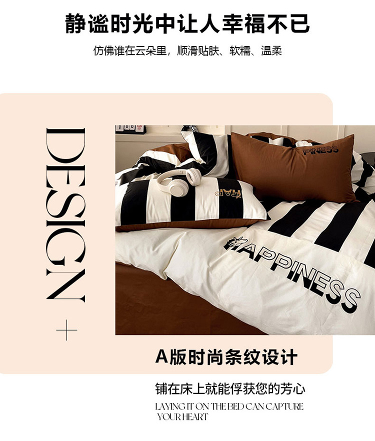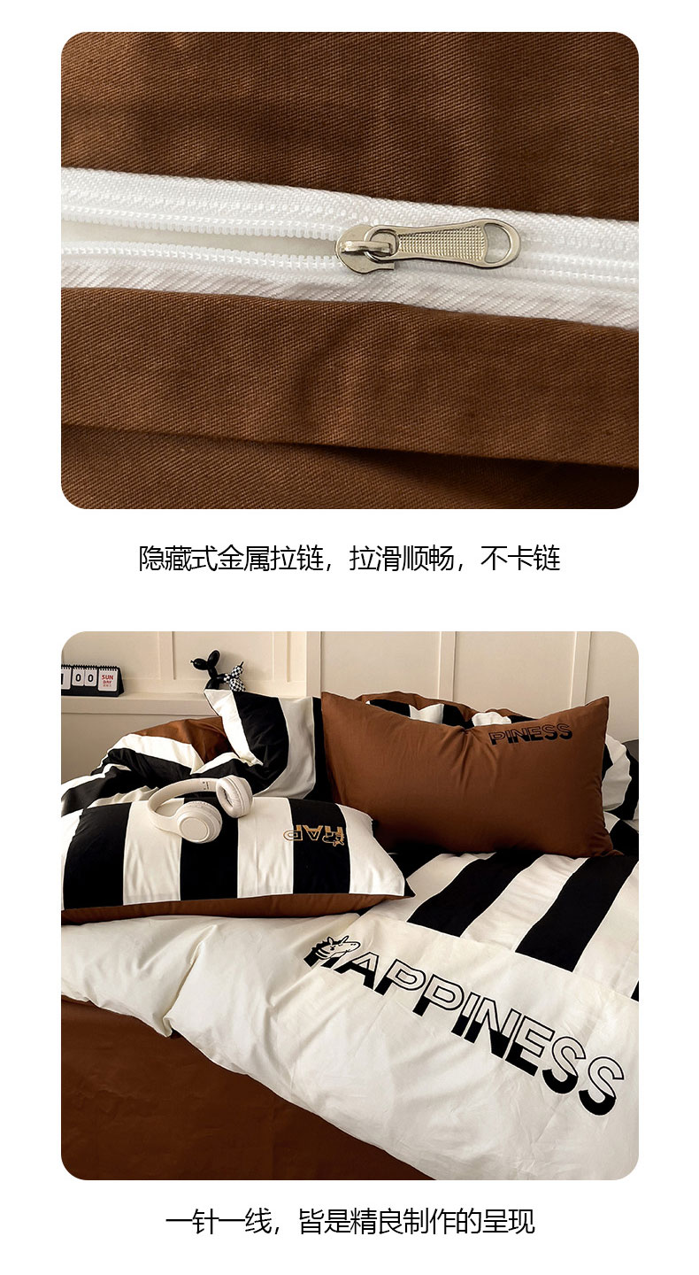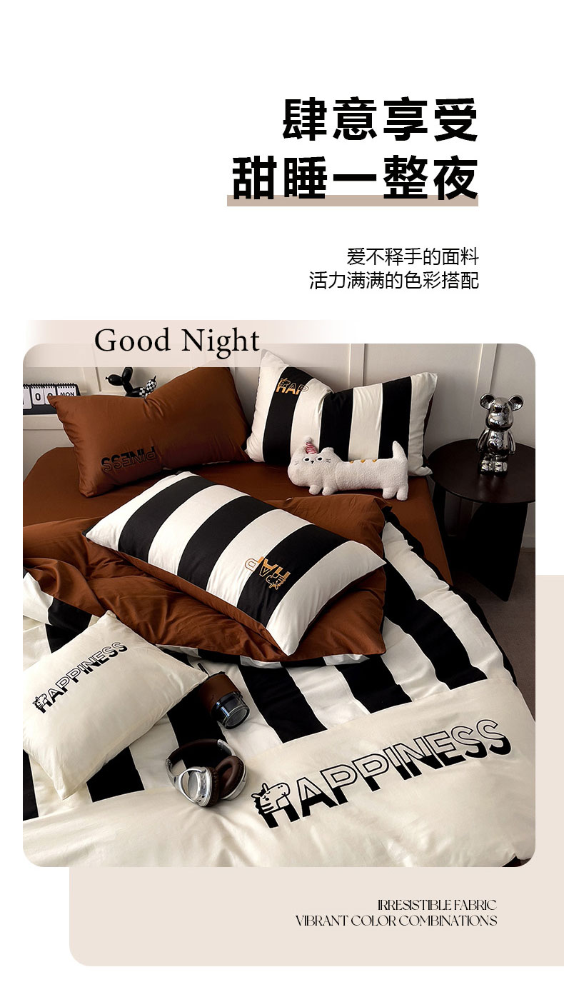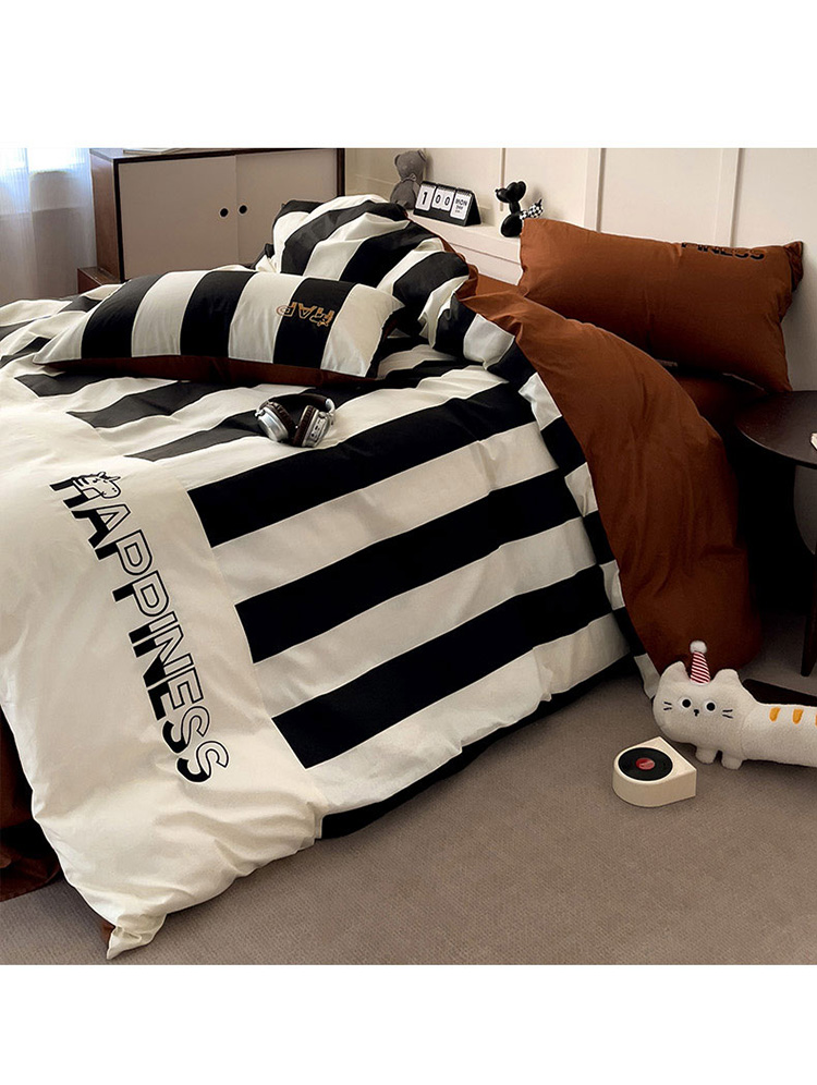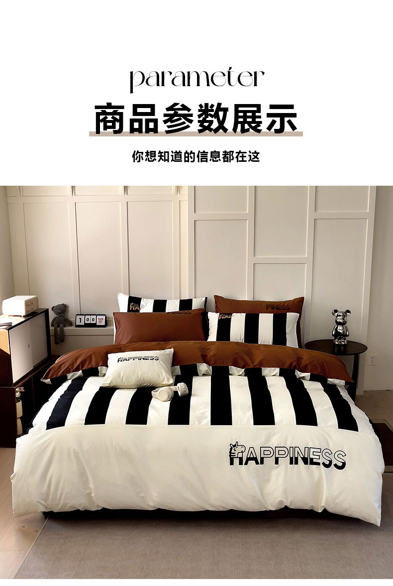 商品名称:娜娜 2025新款全棉拼接条纹绣花四件套 马克-宽条黑