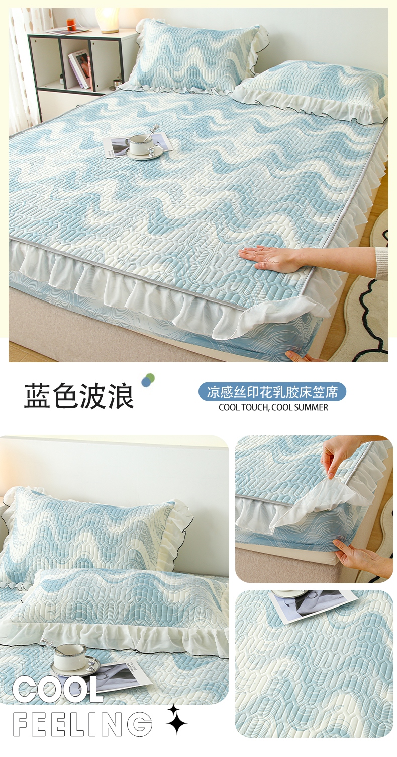 伊人坊 2025新款A类凉感丝乳胶床笠凉席三件套-花边款 花边-蓝色波浪