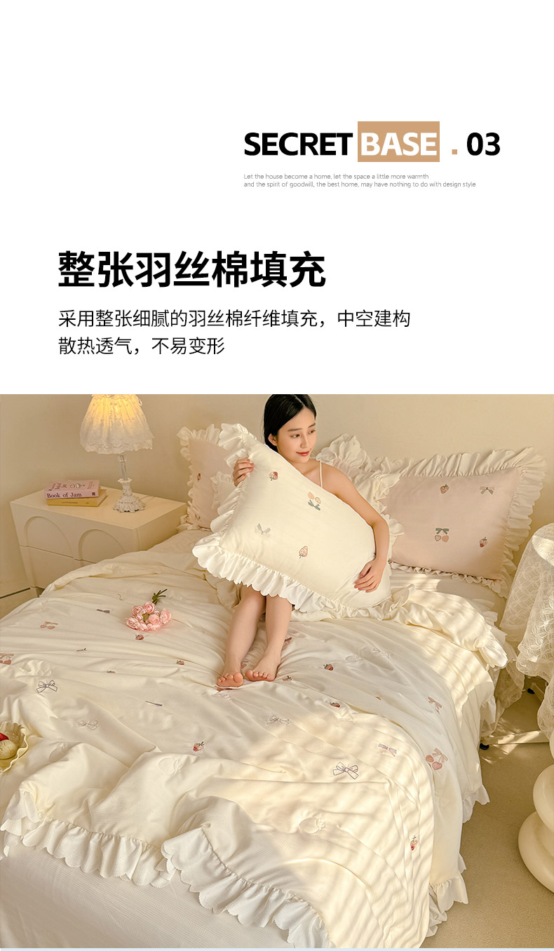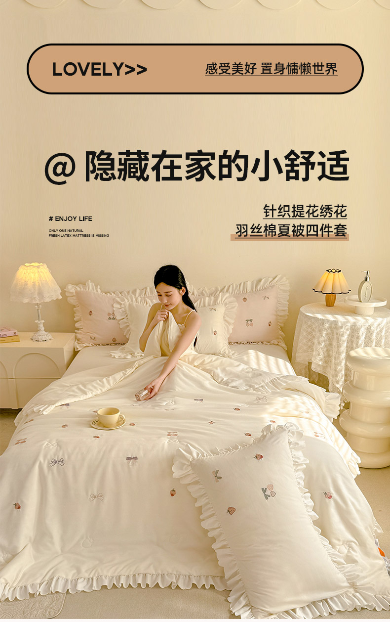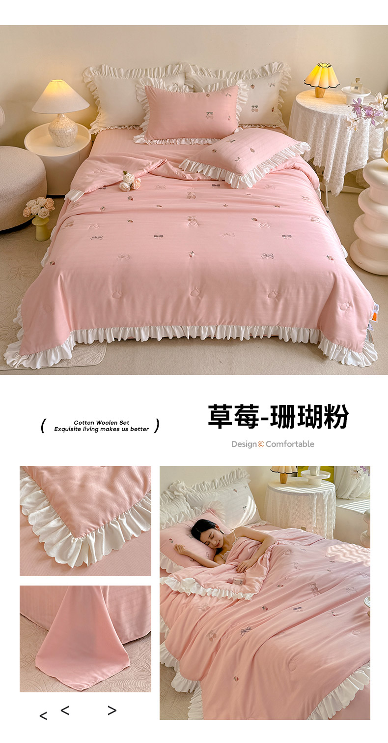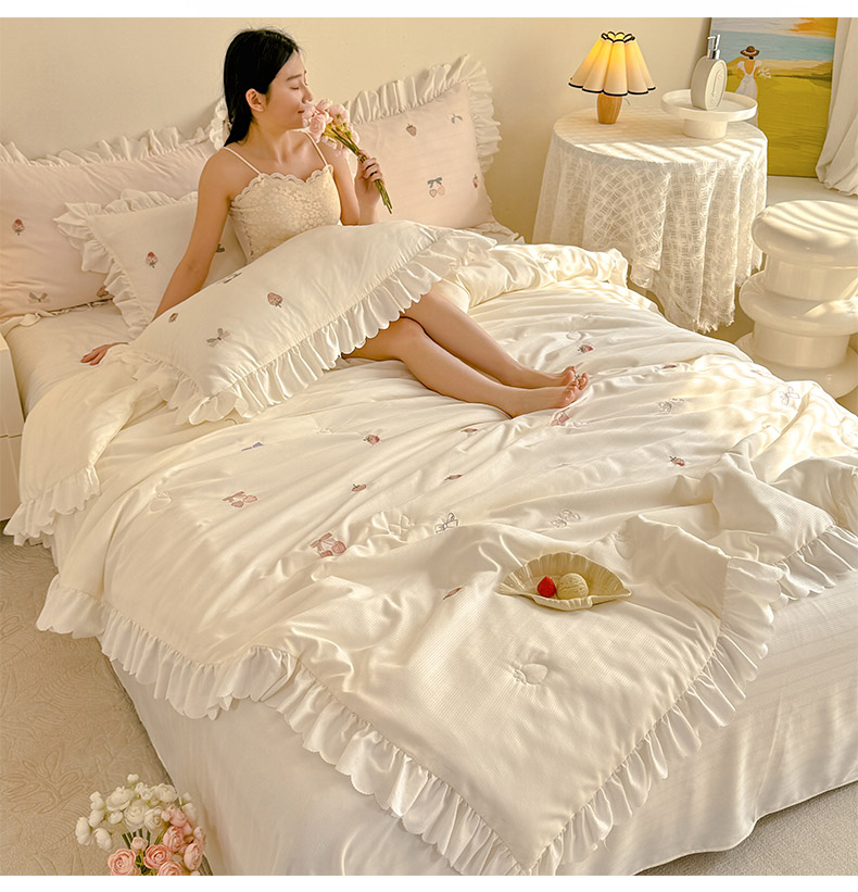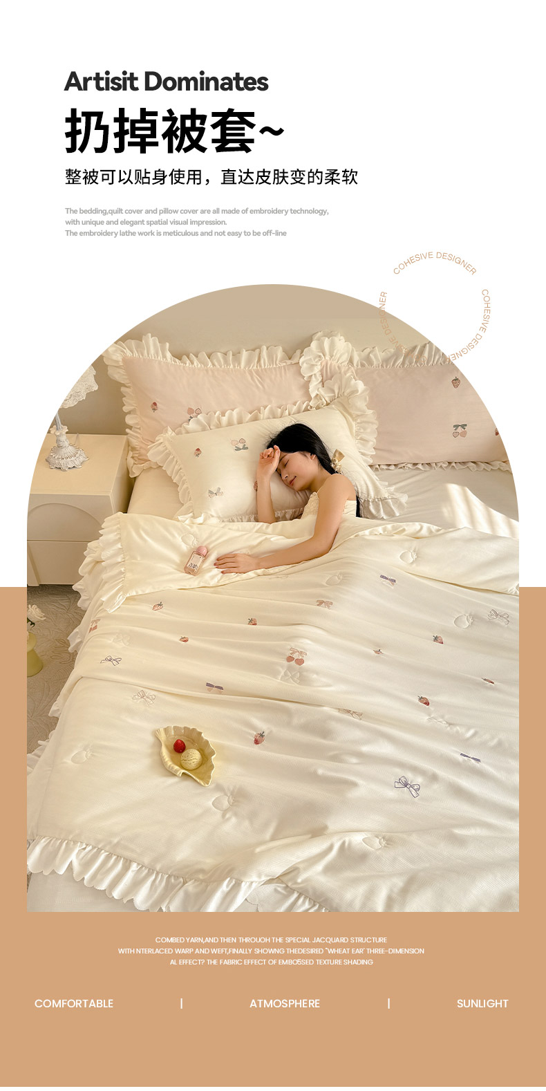 当前位置: 91家纺网 > 商品网购 > 床品套件 > 四件套 > 夏被四件套 > 绒世界 绒世界 2025针织提花绣花小清新夏被四件套 草莓-奶白