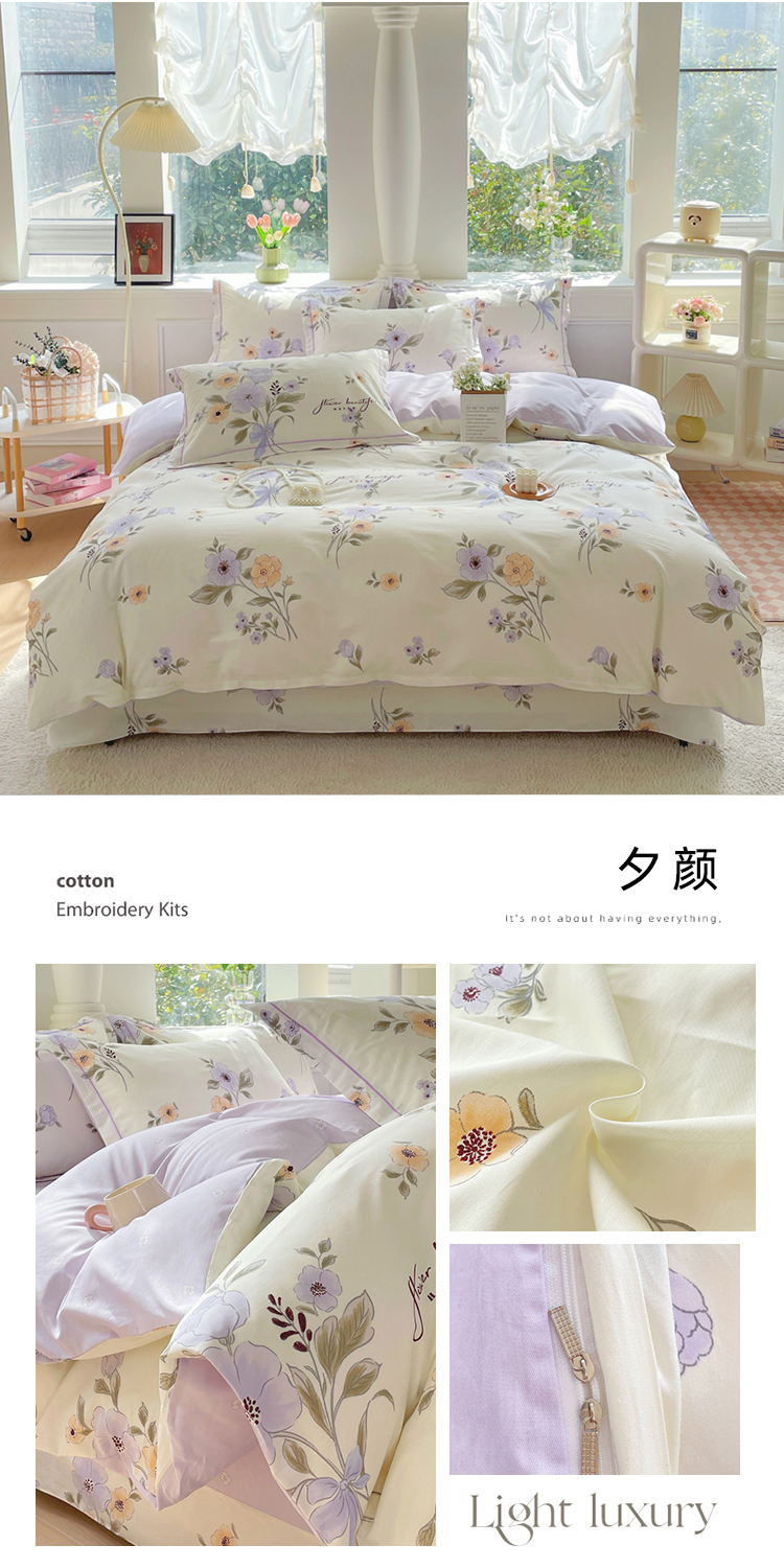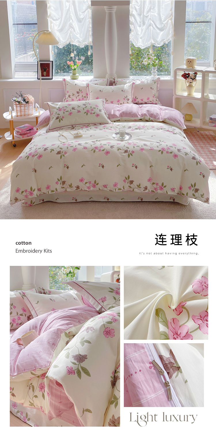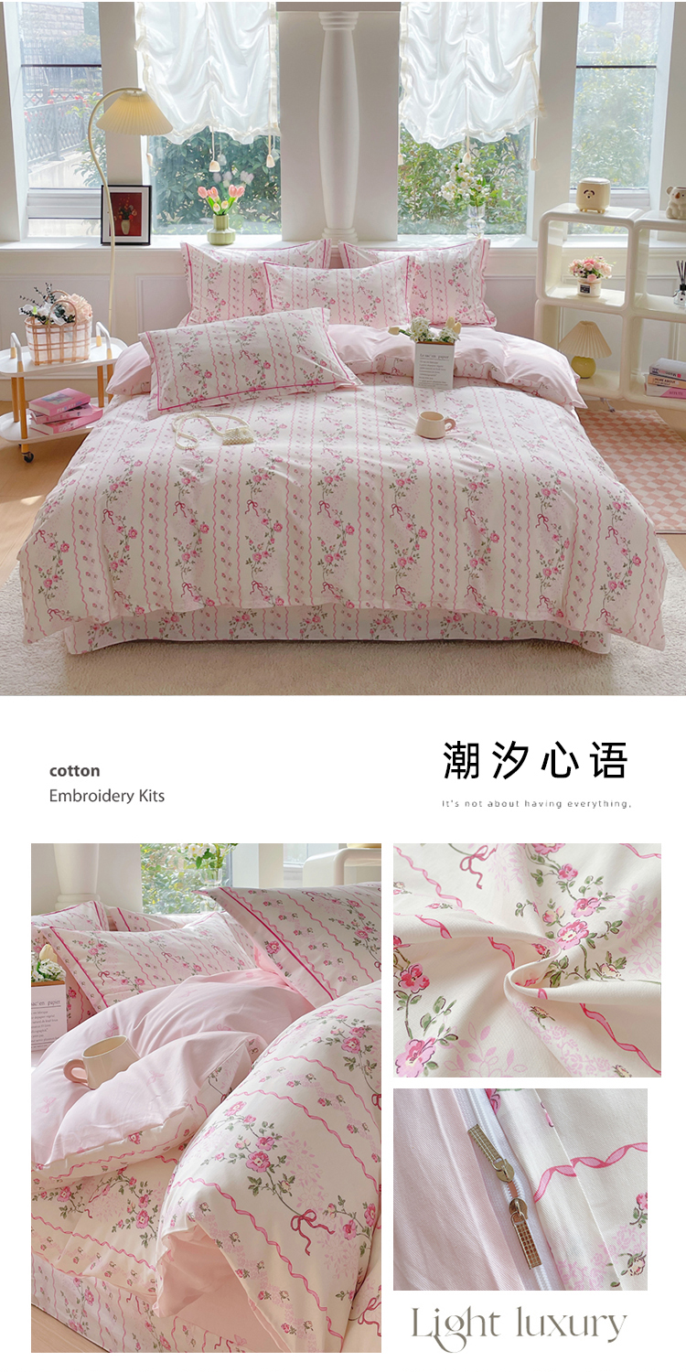 铭博家纺 新款直播爆款网红全棉四件套13070印花吊边一字绣纯棉被套工艺款 花语呢喃,花语呢喃