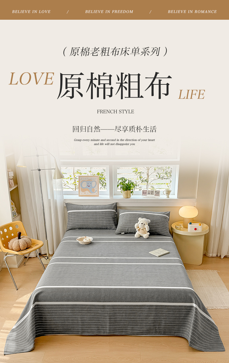 当前位置: 91家纺网 > 商品网购 > 床品套件 > 三件套 > 博弈家纺 2025新款亲肤舒适原棉老粗布床单凉席三件套系列 冷灰