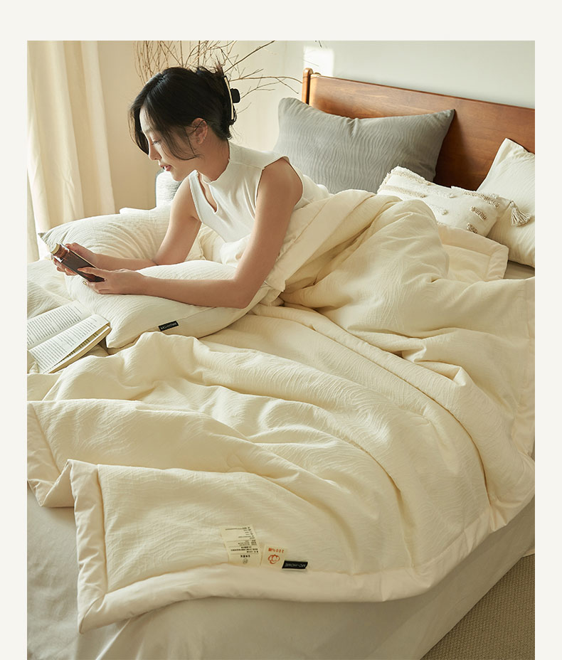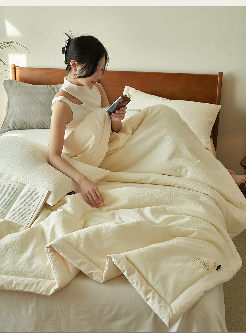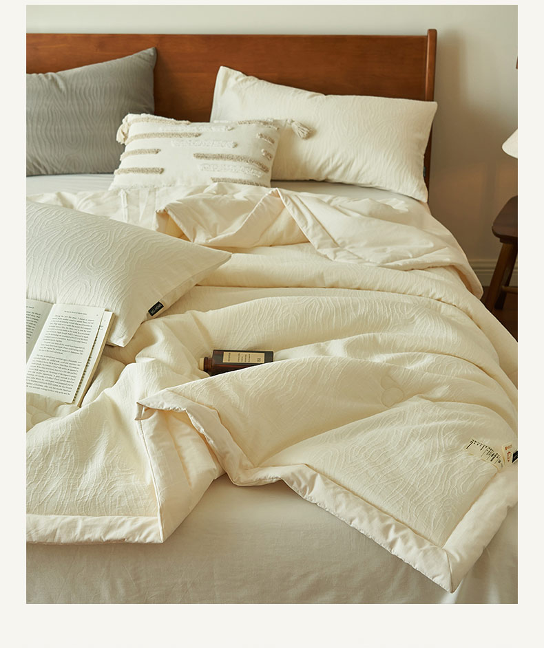 • 91家纺网 家纺一手货源 找家纺 寐绸家纺 2025新款纯棉水洗棉三层提花大豆纤维夏被四件套 三层纱树纹夏被-本白