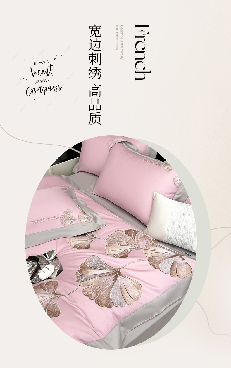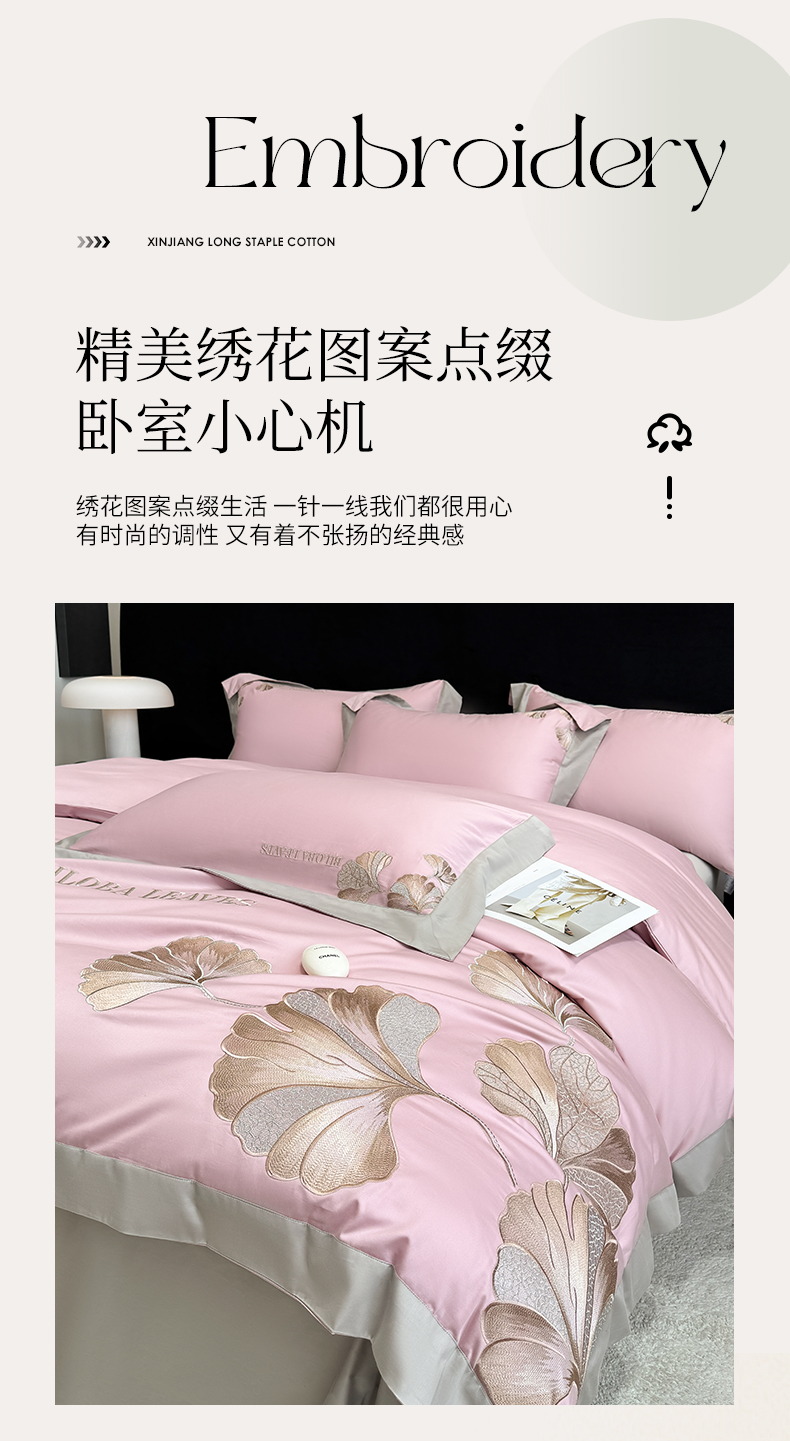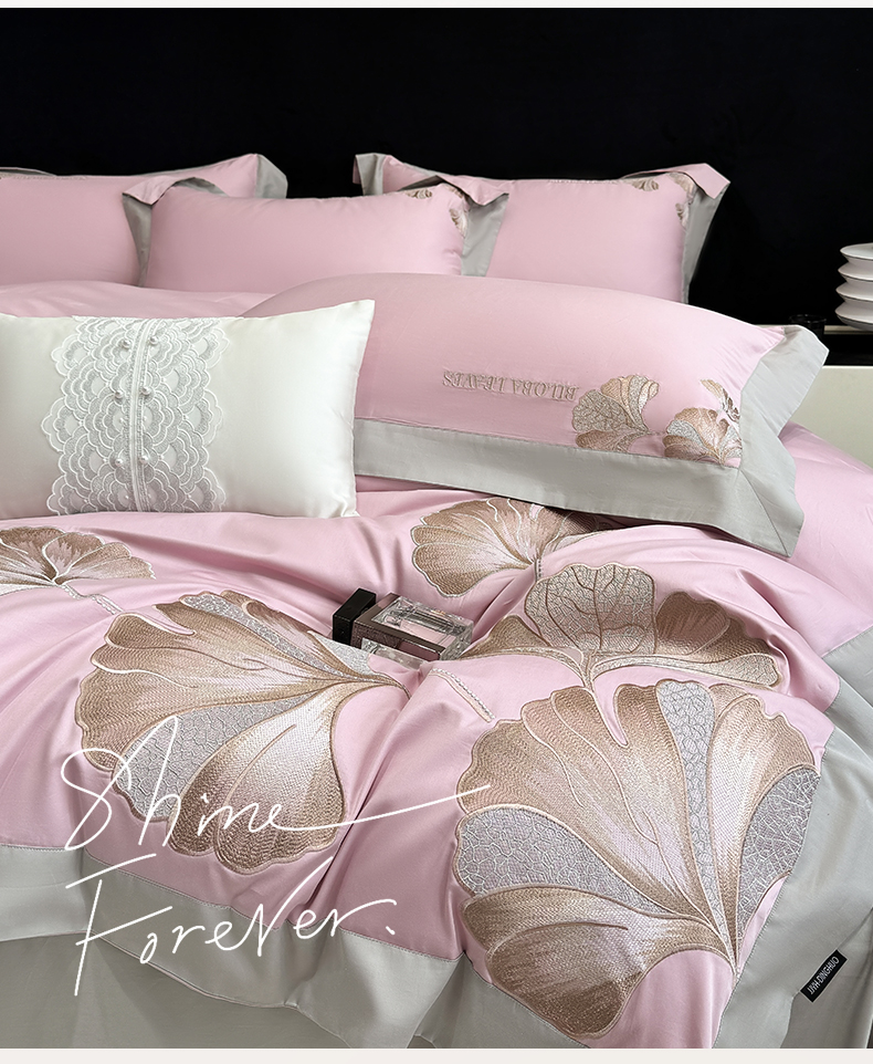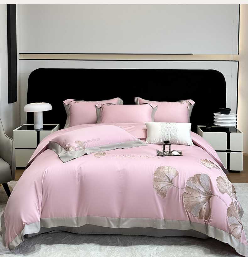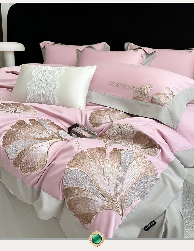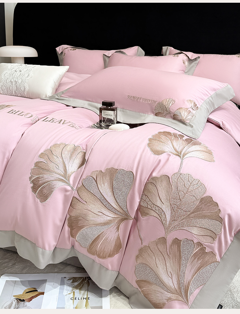 商品名称:家居1号 2025新款a类长绒棉绣花四件套 金色银杏-玫瑰粉