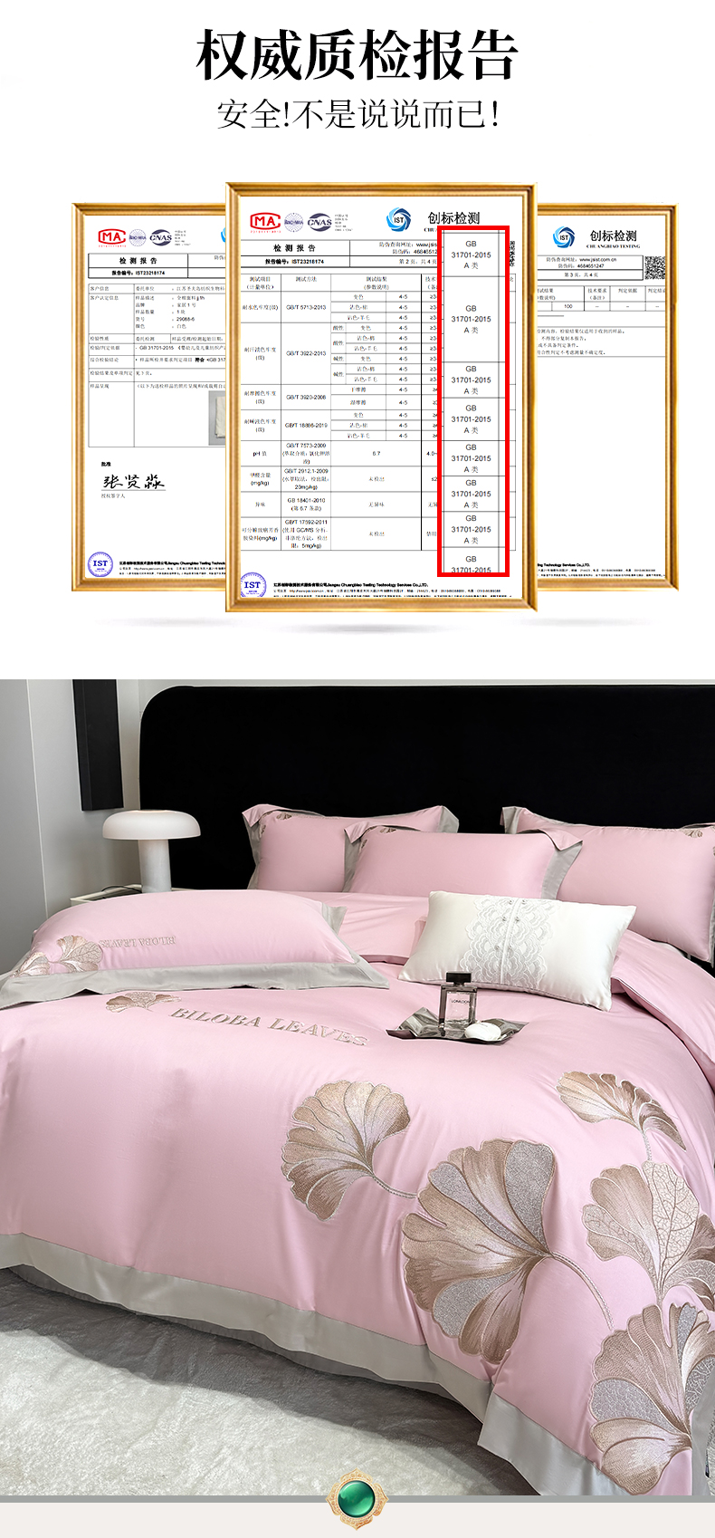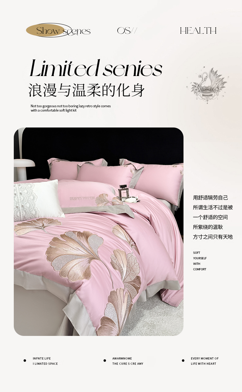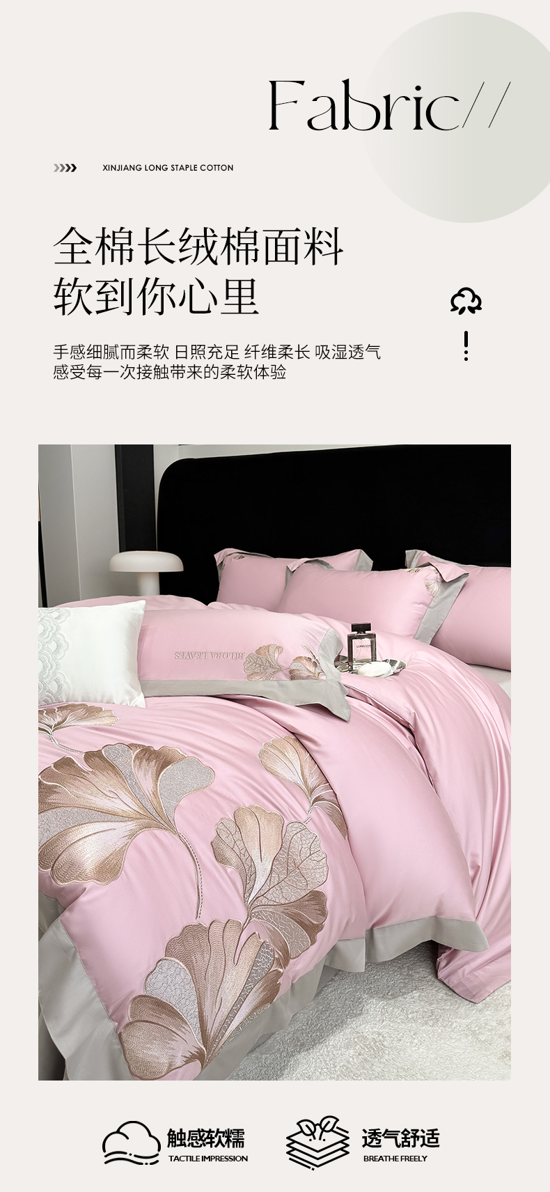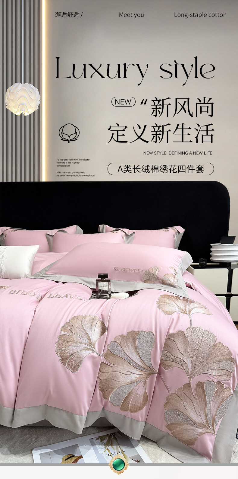 商品名称:家居1号 2025新款a类长绒棉绣花四件套 金色银杏-玫瑰粉