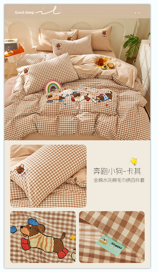 当前位置: 91家纺网 > 商品网购 > 床品套件 > 四件套 > 毛巾绣四件套 > 徕米家居 2025新款色织全棉水洗棉毛巾绣四件套 奔跑小狗-卡其