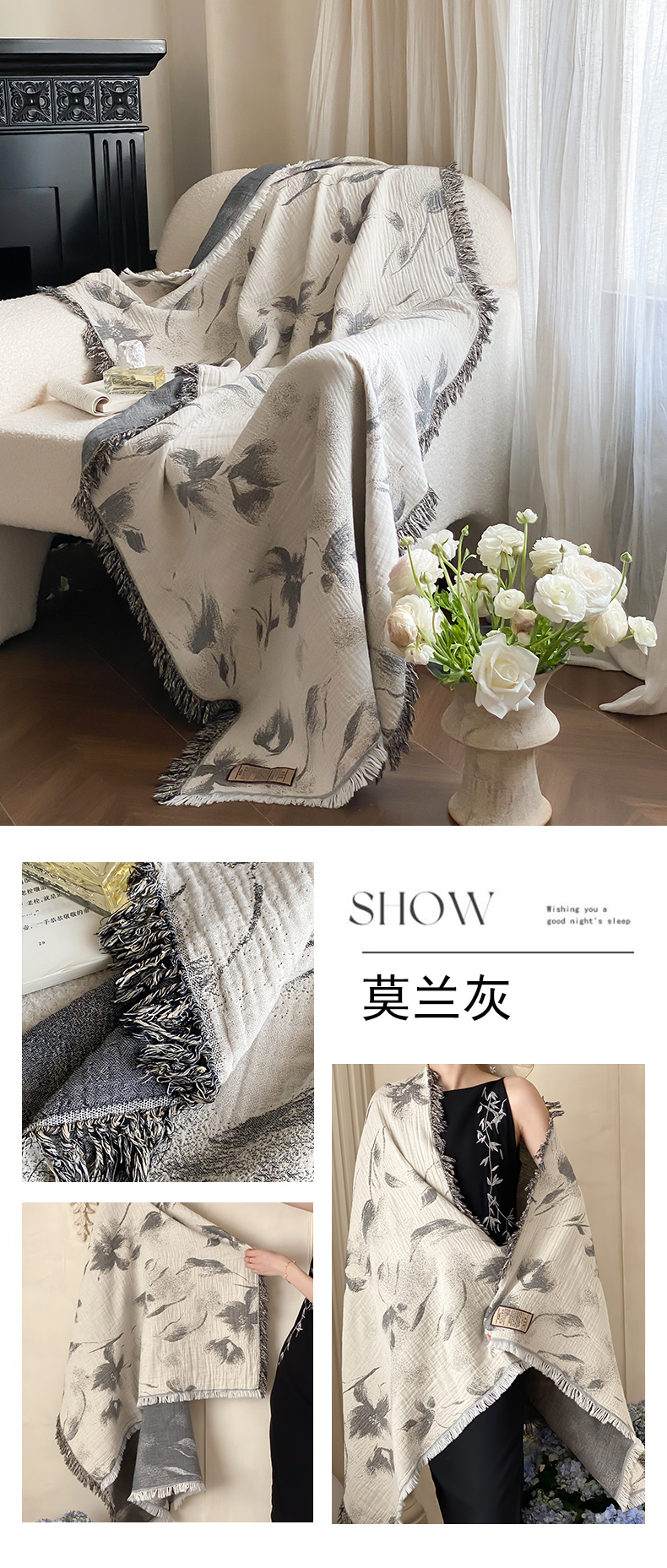 商品名称:麻依 2025新款全棉流苏纱布披肩浴巾旅行毯 莫兰灰