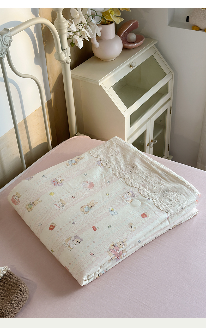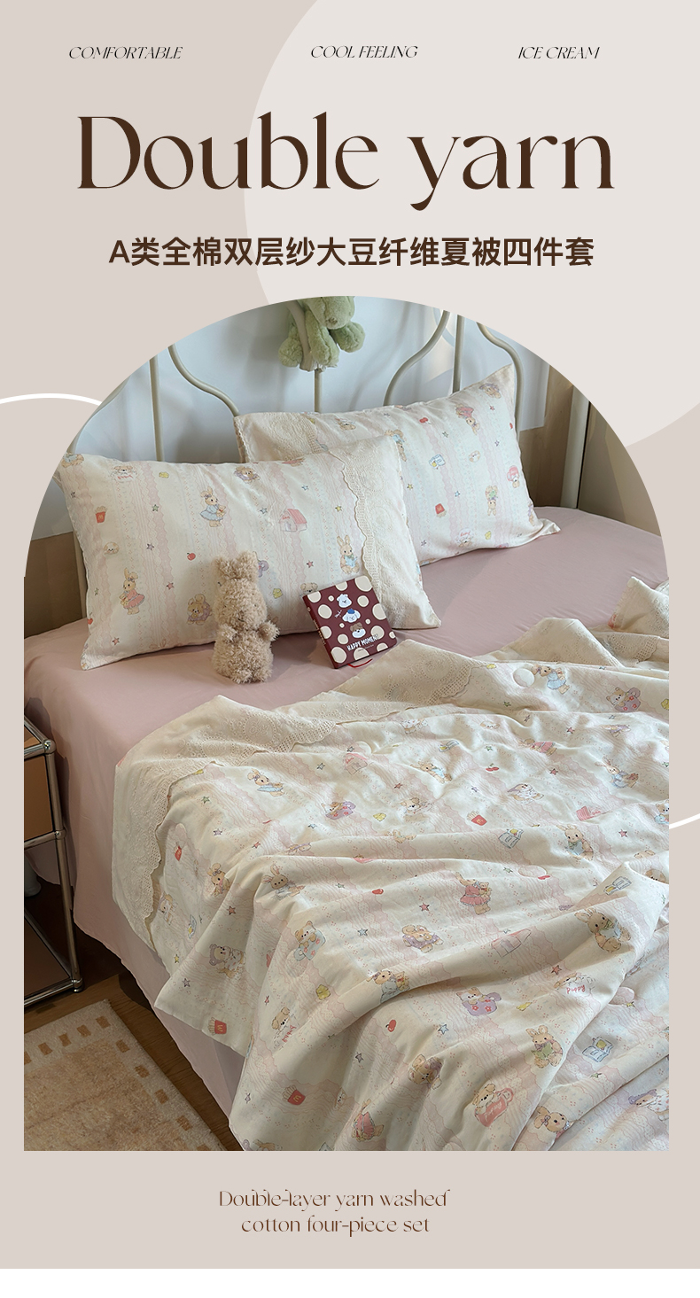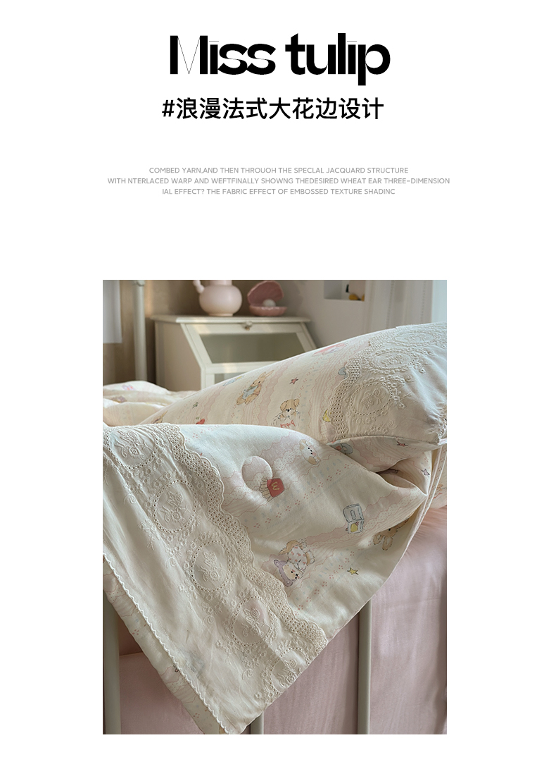 当前位置: 91家纺网 > 商品网购 > 床品套件 > 四件套 > 夏被四件套 > 绫韵家纺 2025夏季新品A类全棉纯棉双层纱法式大花边夏被空调被四件套 茉叶