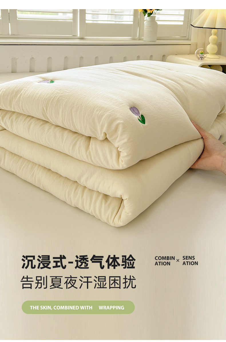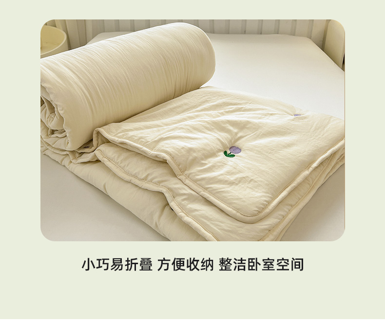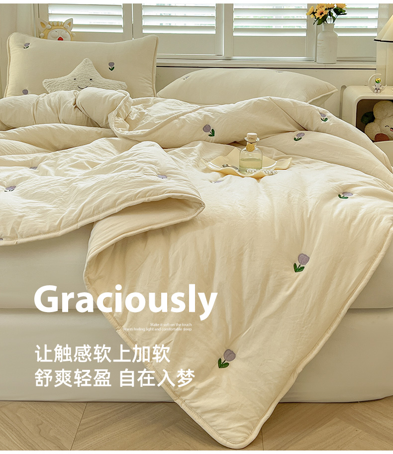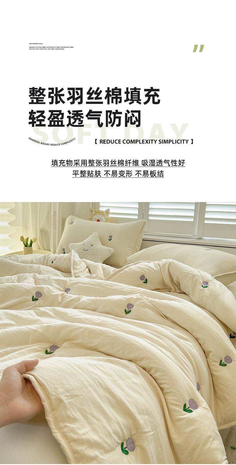 推推家纺 2025新款水洗棉玫瑰刺绣夏被 郁金香-米白