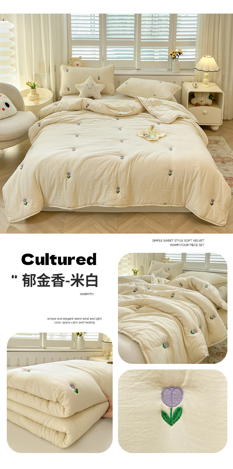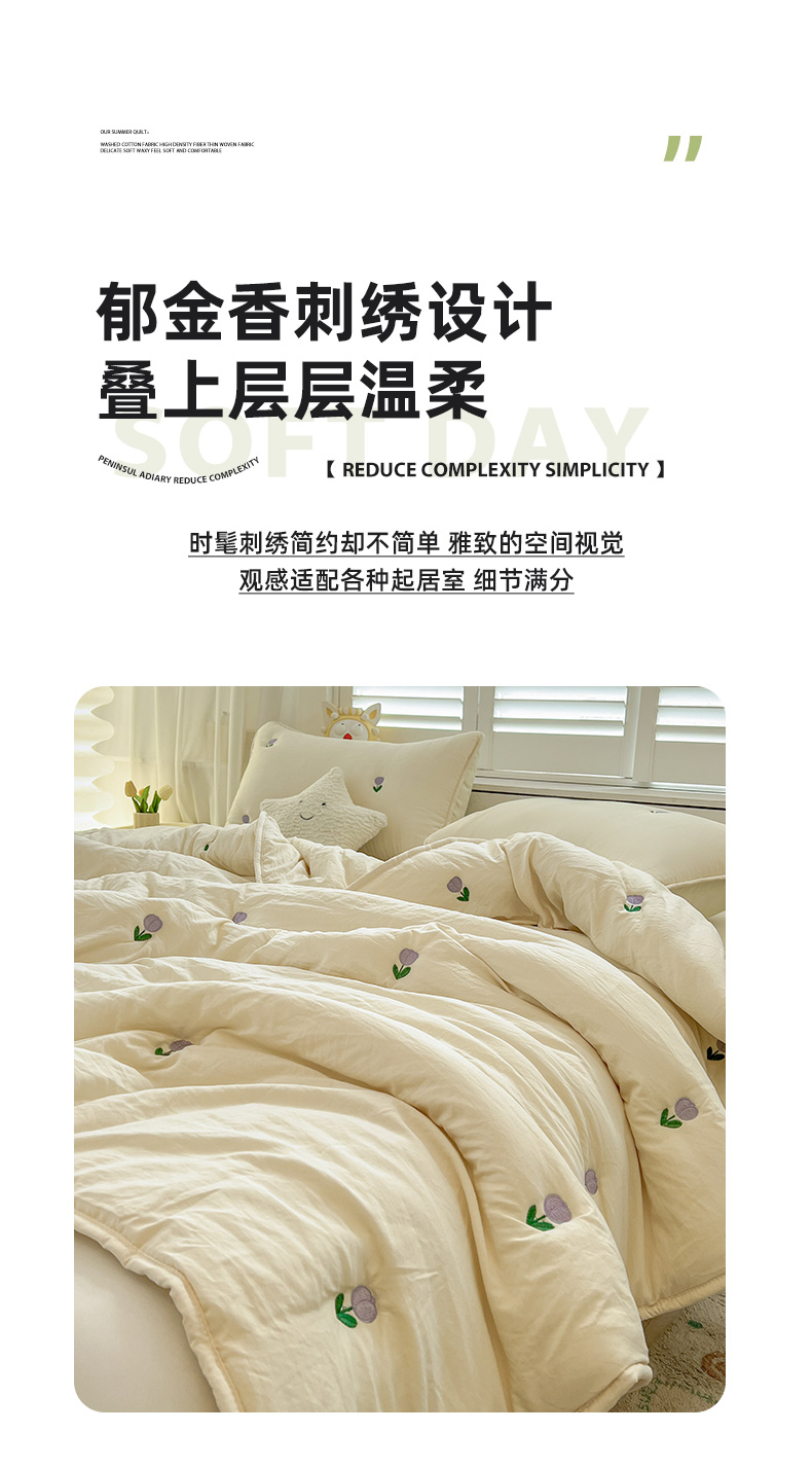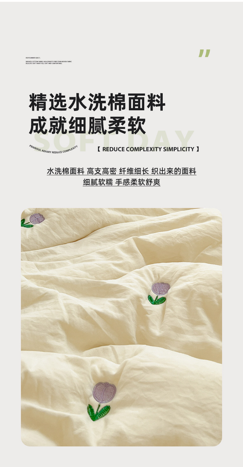 商品名称:推推家纺 2025新款水洗棉玫瑰刺绣夏被 郁金香-米白