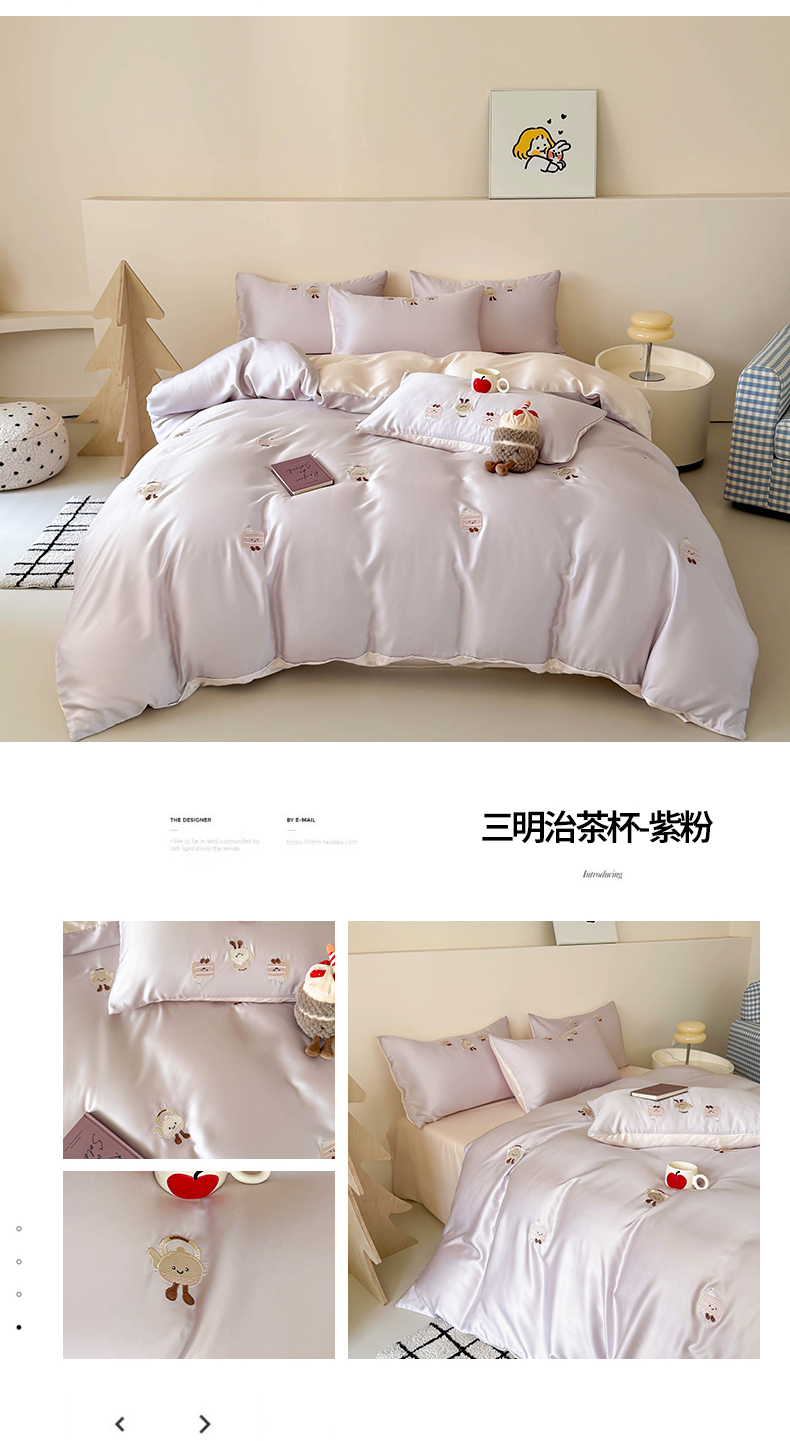 商品名称:蜜柚 2025新品60S奥地利兰精天丝小元素刺绣三件套四件套 三明治茶杯-紫粉