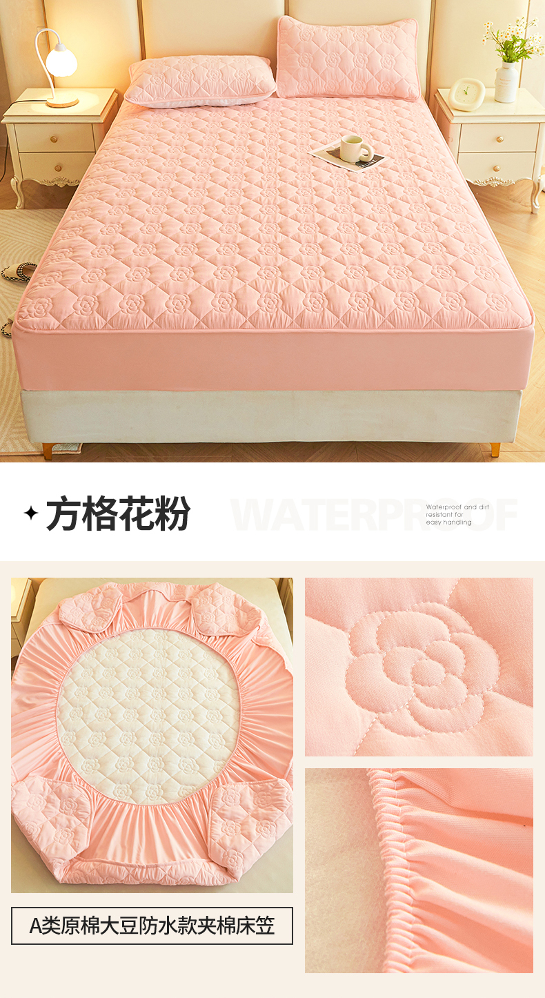 • 91家纺网 家纺一手货源 找家纺 小萌虎2025新款A类原棉大豆防水款夹棉床笠 方格花粉