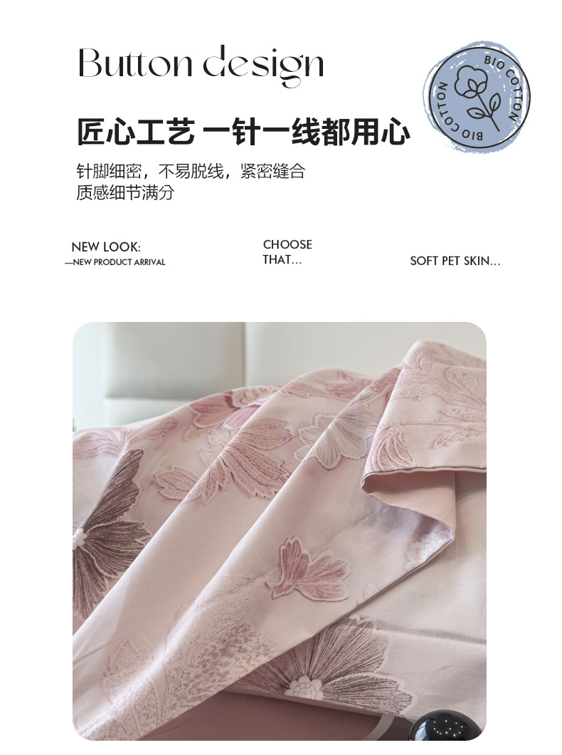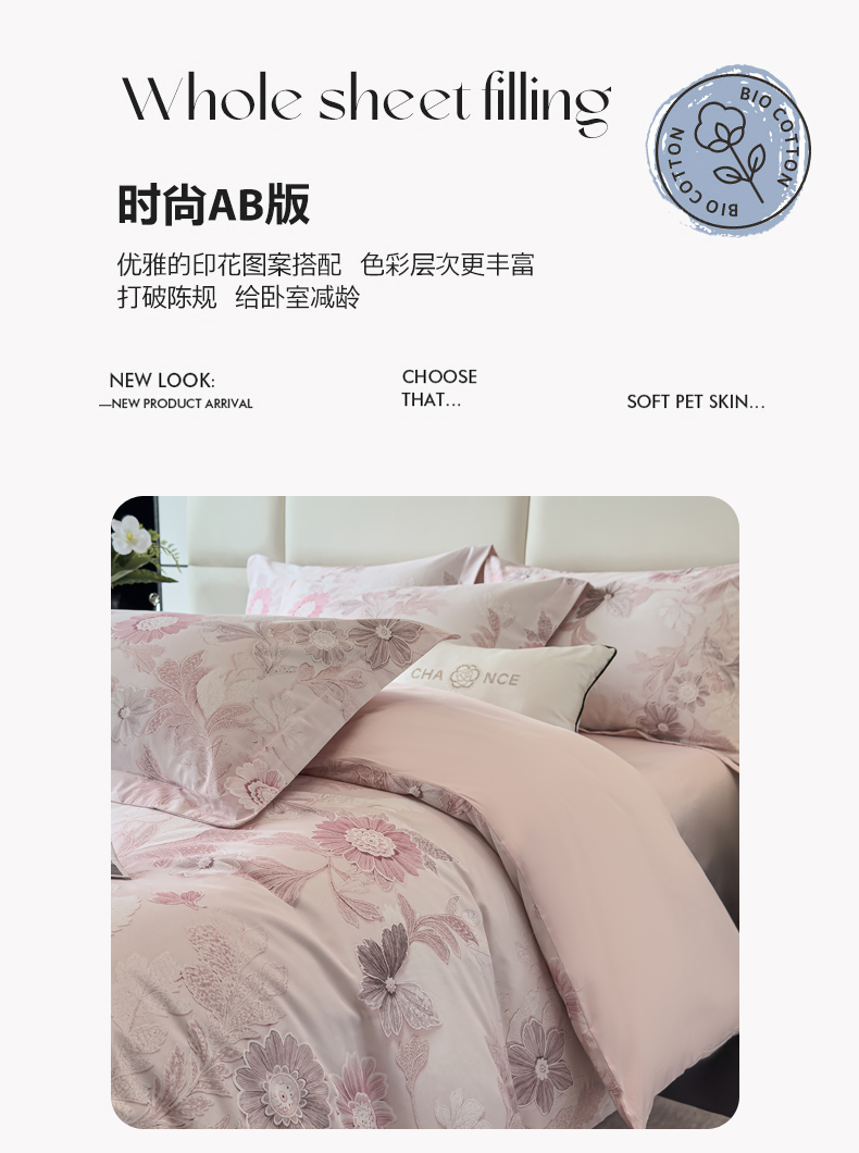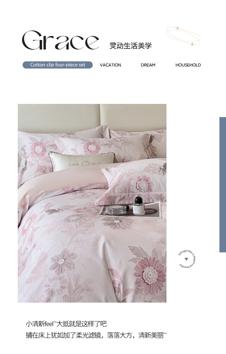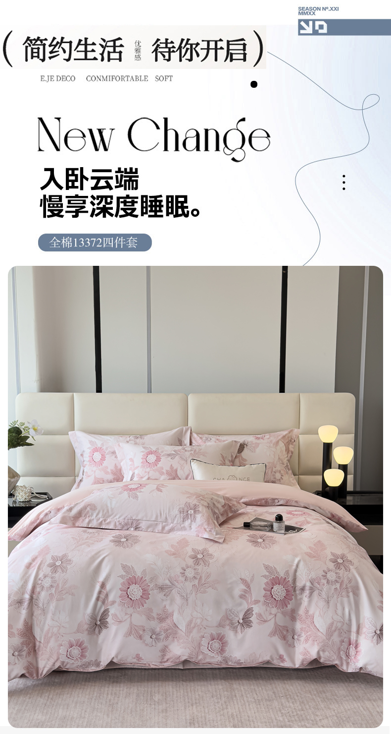 洺兰家居 2025新款高支高密轻奢数码印花四件套长绒棉纯棉四件套 之简-粉
