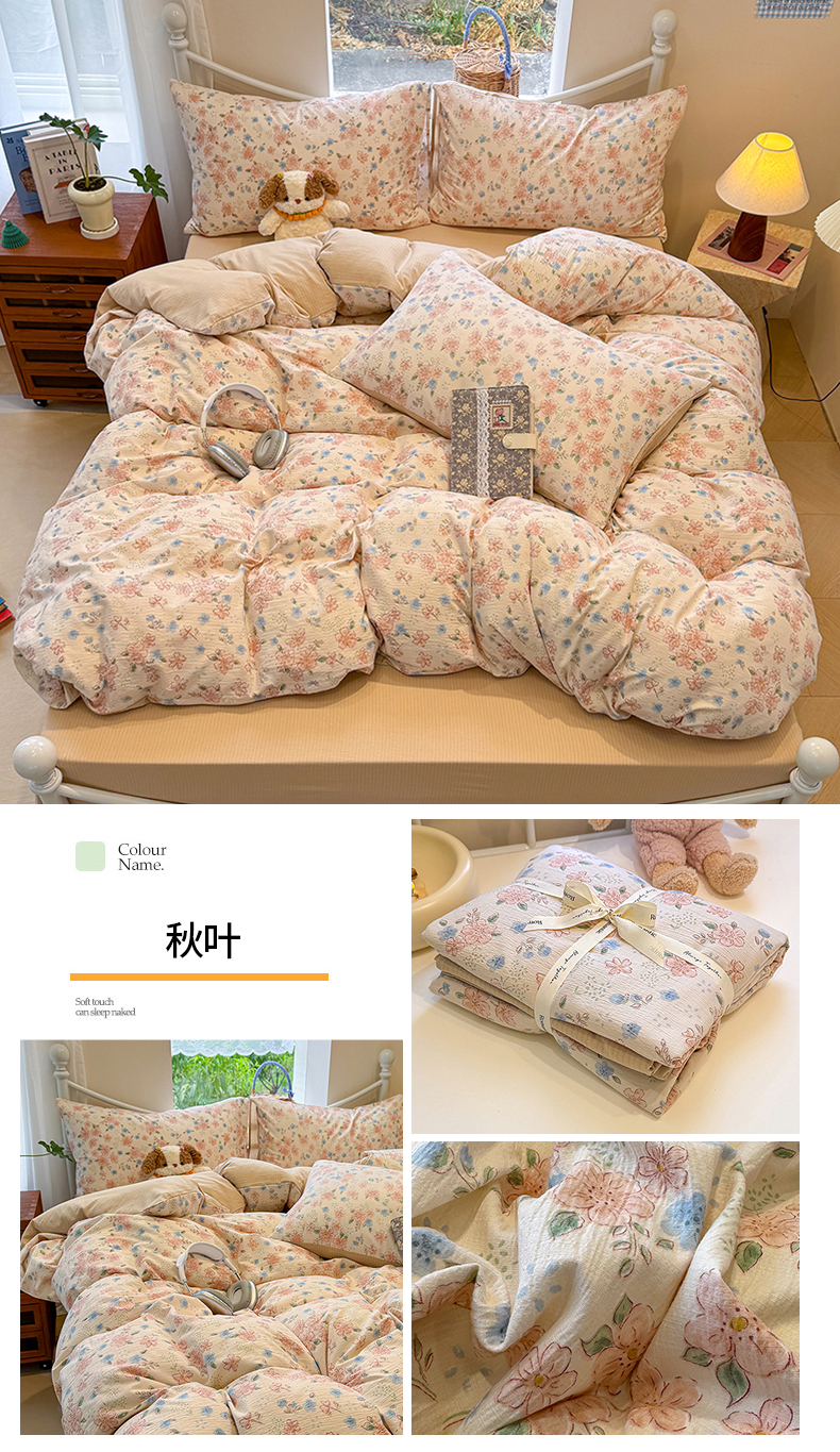 当前位置: 91家纺网 > 商品网购 > 床品套件 > 四件套 > 双层纱四件套 > 颜选 2025春夏新款双层纱印花四件套 秋叶