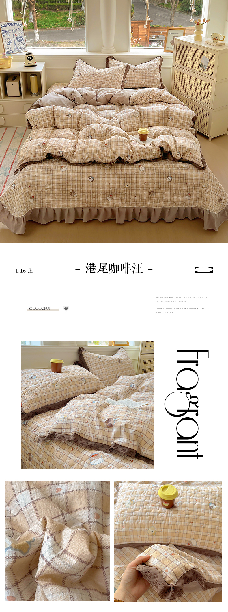 (总)美梦家纺 2026新款高克重全棉花边云感棉床盖四件套,希雅莉·米,雅格·粉,樱桃蜜·咖,尤丽叶·咖,紫藤碎花·咖,莓莓素语·粉,暖小象·兰,浅叶·米,希雅莉·灰