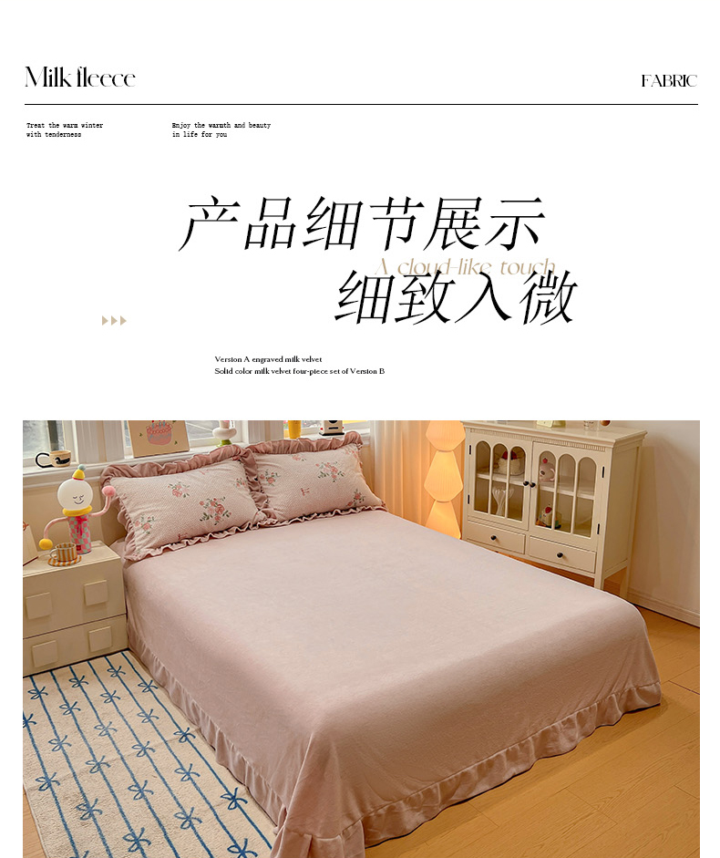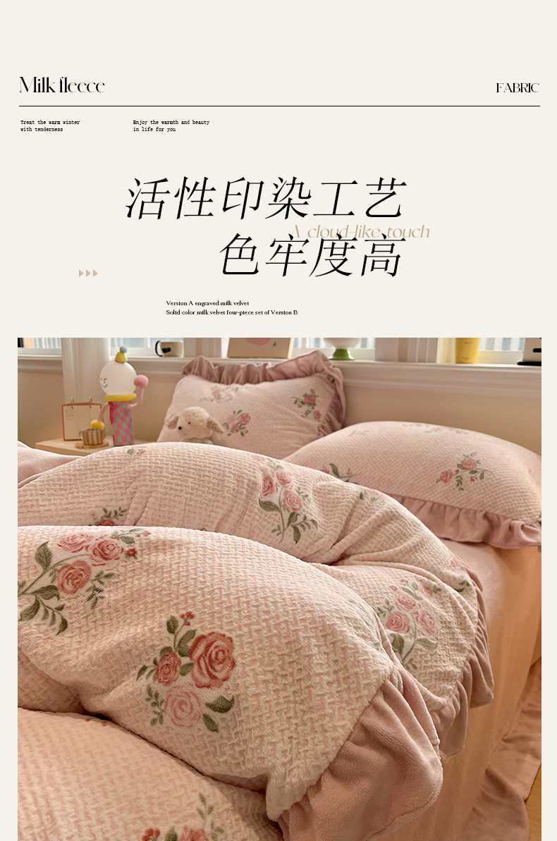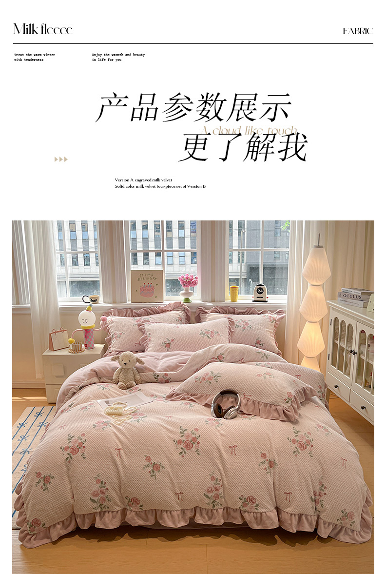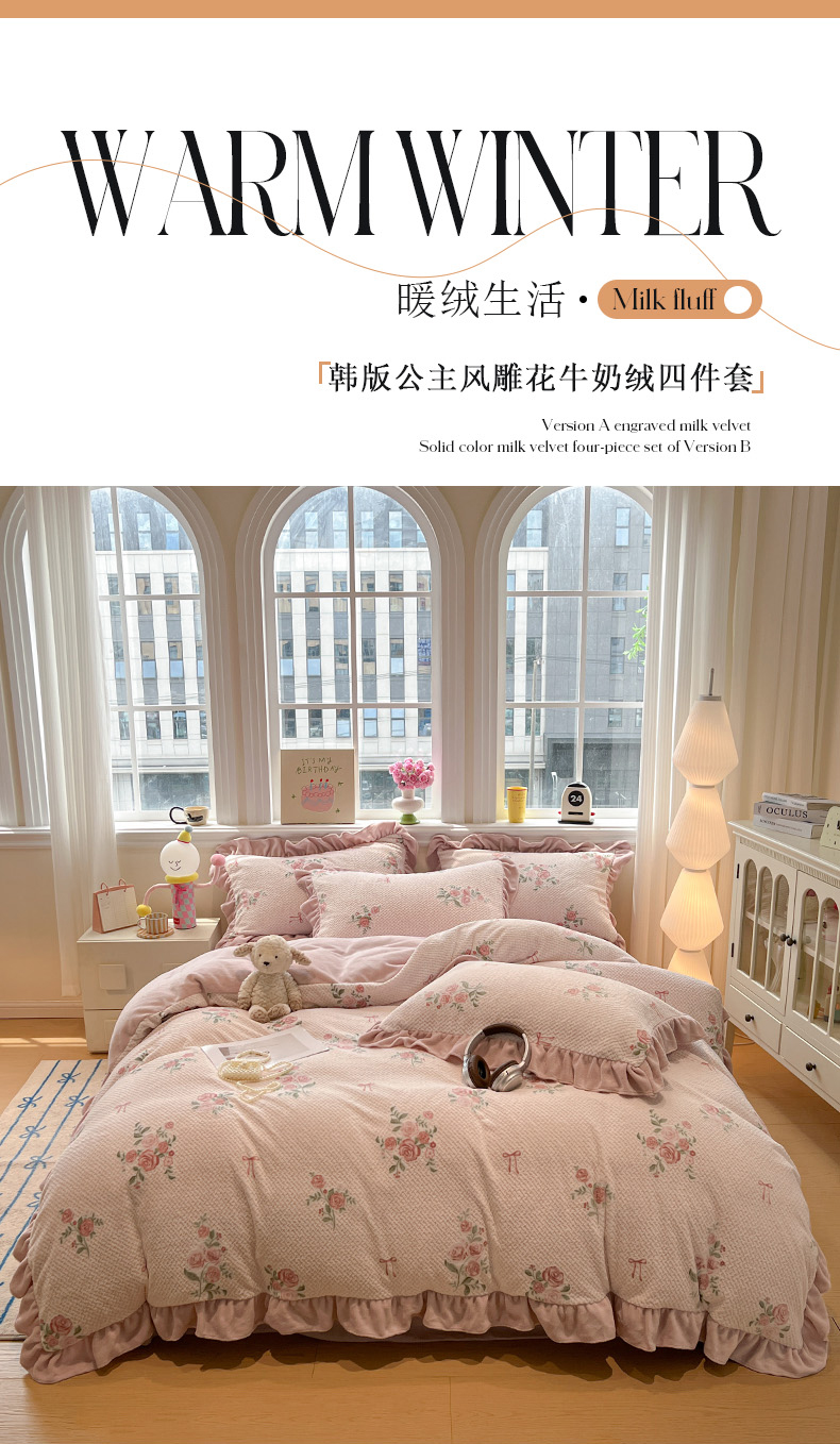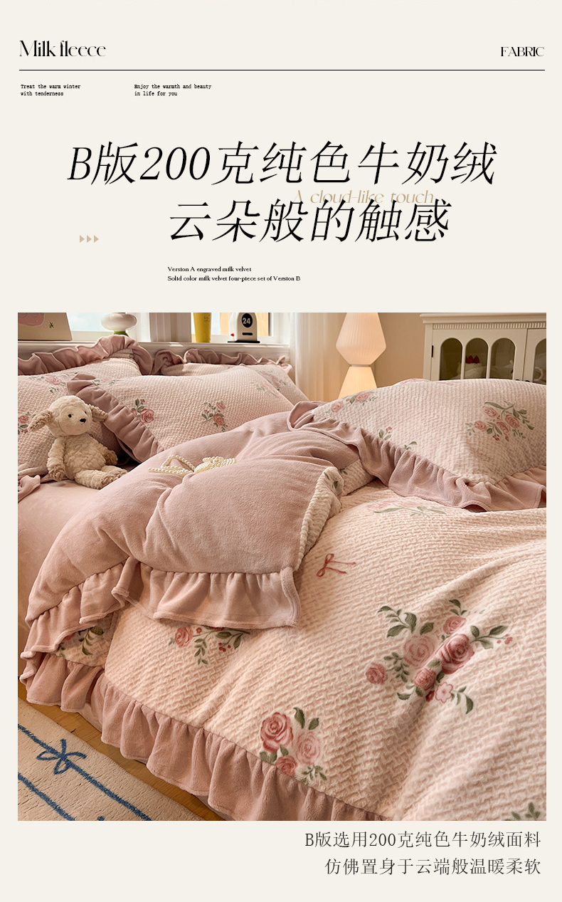 (总)忆生活家纺 2025秋冬韩版公主风雕花牛奶绒四件套-小香茶花系列,小香茶花-杏仁粉,小香茶花-帛紫,小香茶花-秋绿,小香茶花-象牙白