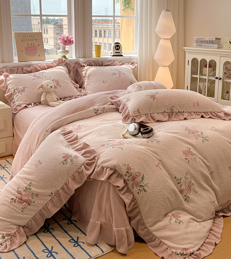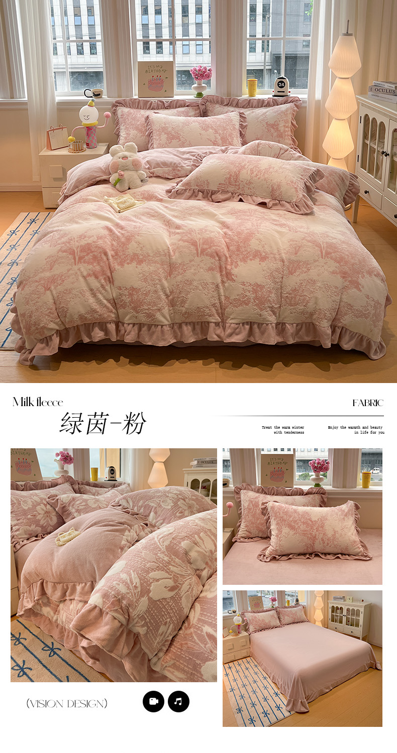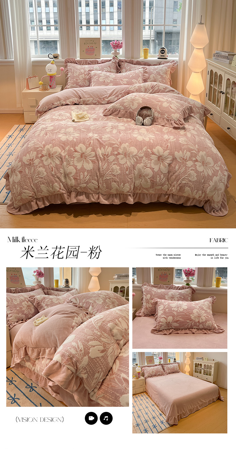 忆生活家纺 2025新款秋冬韩版公主风5D立体雕花牛奶绒四件套 落川花海-粉