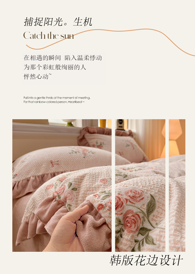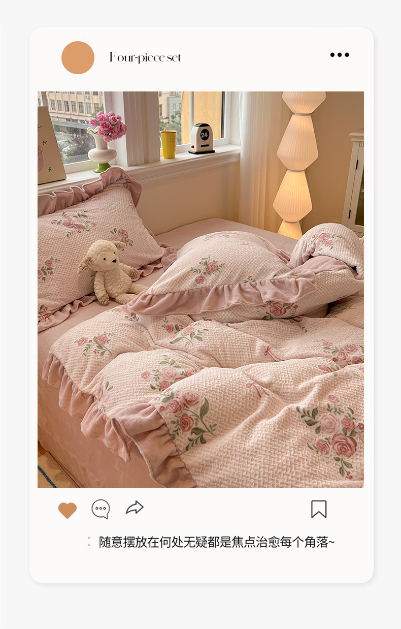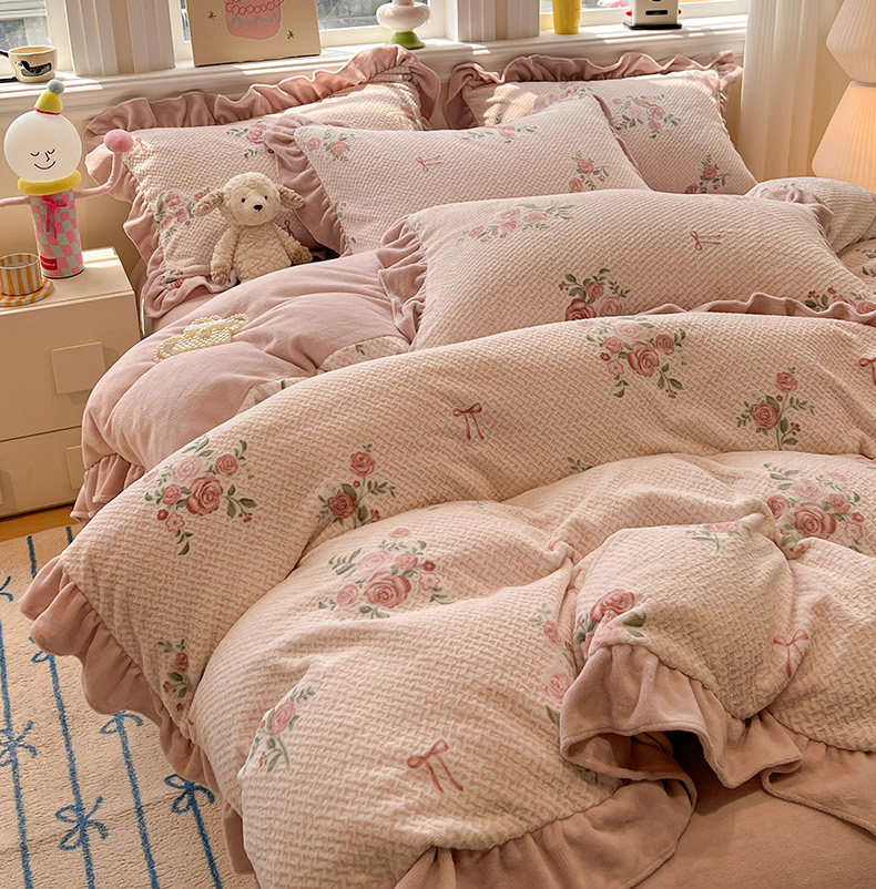 商品名称:忆生活家纺 2025新款秋冬韩版公主风5D立体雕花牛奶绒四件套 落川花海-粉